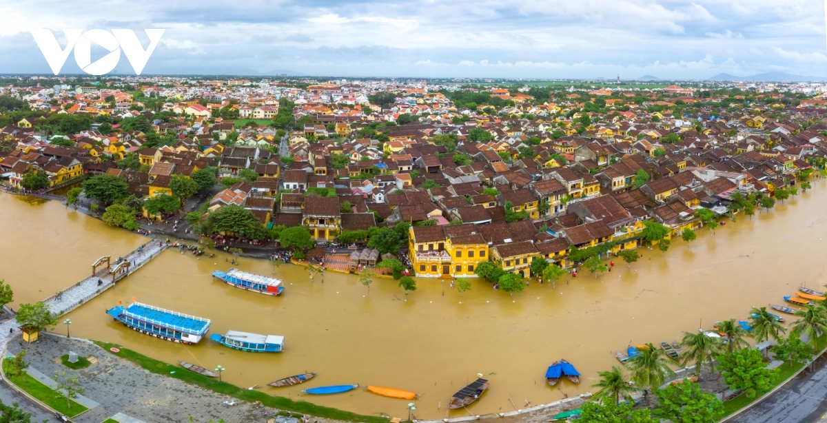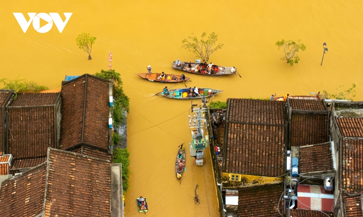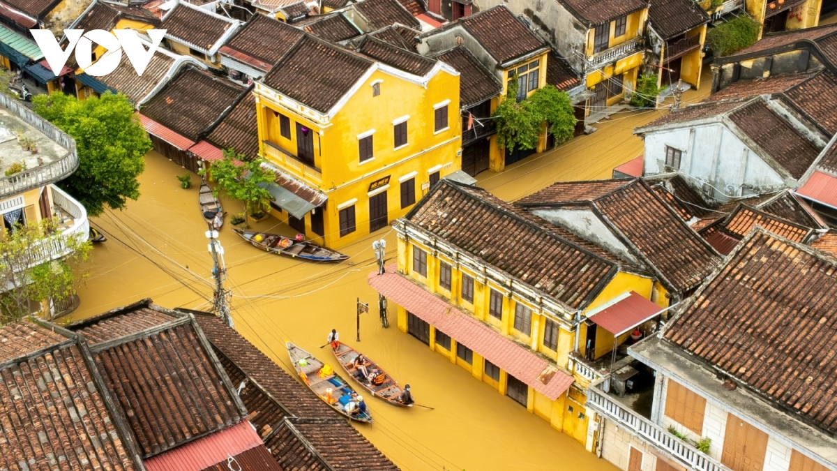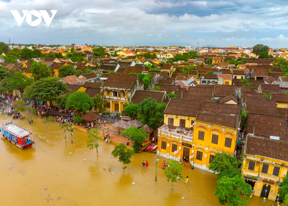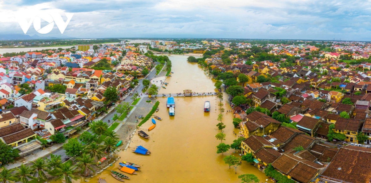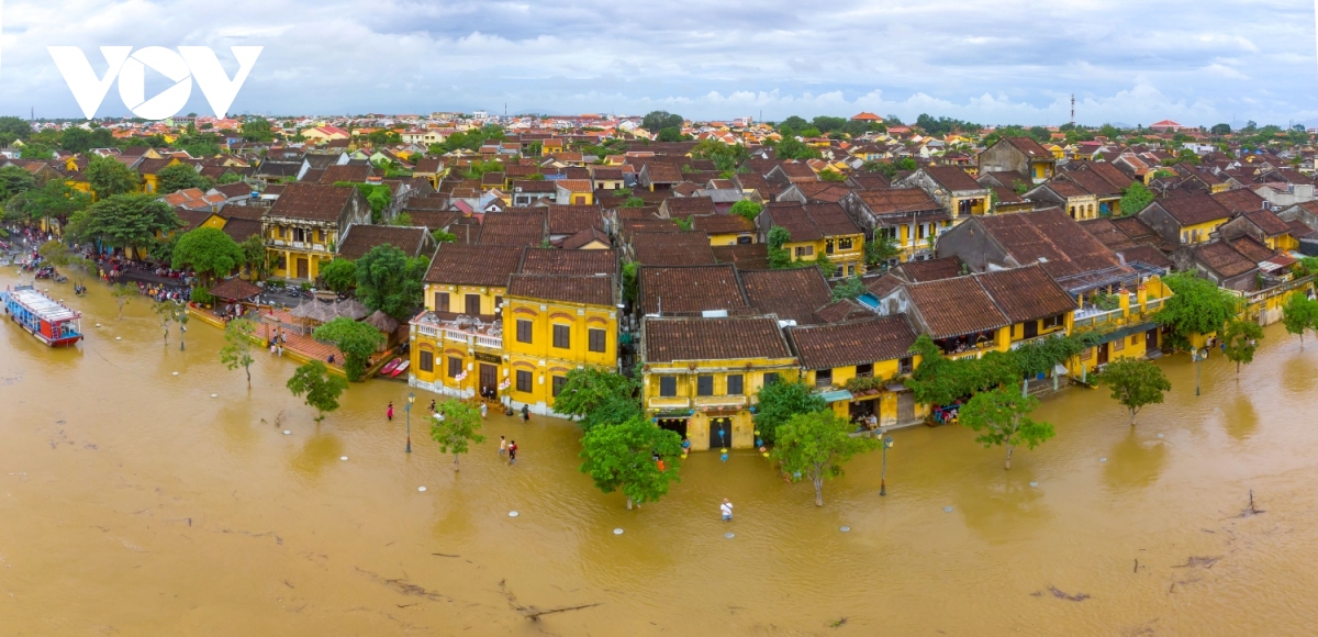 Phố cổ Hội An mùa lũ nhìn từ trên cao. |