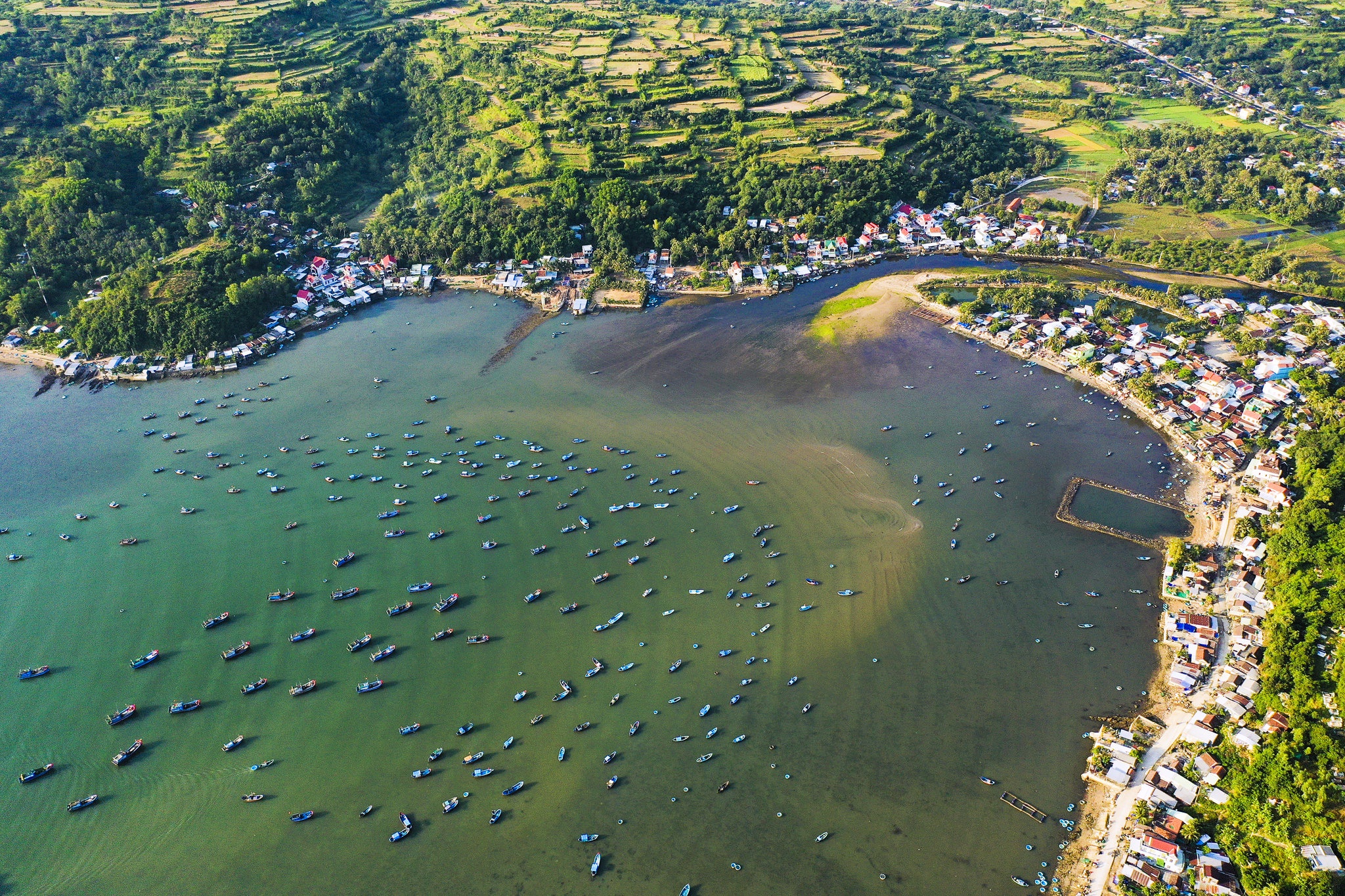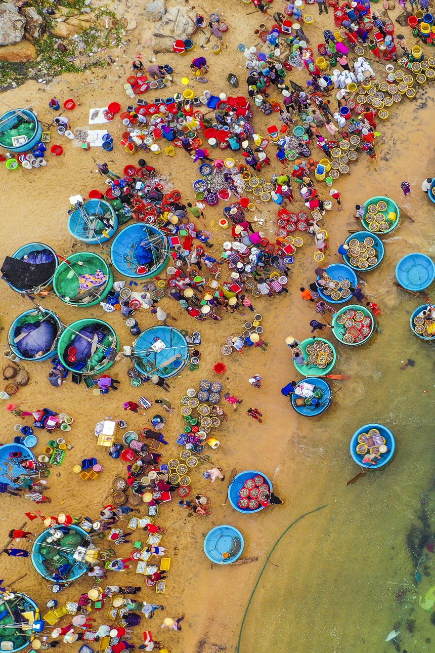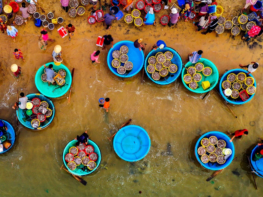 Cảnh giăng lưới đầy mê hoặc của ngư dân Phú YênTrên nền đại dương, hàng trăm mét lưới được tung xuống, tạo nên những hình thù ấn tượng. Mỗi lần quăng lưới, người dân thu về hàng nghìn con cá cơm, ở khu vực cách bờ biển chưa đầy 2 km và độ sâu gần 10 m. Bên cạnh đó là những ghe chài, thuyền thúng đầy sắc màu lênh đênh giữa biển khơi, tao nên sự sống động cho bức tranh đại dương. Từ trên cao nhìn xuống, hàng trăm chiếc lồng nuôi tôm của ngư dân làng chài tạo nên tuyệt tác nghệ thuật độc đáo, được xếp đặt bởi bàn tay con người. Sau khi đánh bắt, ngư dân sẽ thu về những mẻ lưới đầy cá, chất lên giỏ hàng và mang ra chợ bán. Cá cơm ngần, loại cá nhỏ thân trắng muốt, là đặc sản nổi tiếng tại đây. Để có những mẻ cá cơm căng lưới và tươi ngon nhất, ngư dân thường phải ra khơi lúc sáng sớm hoặc chiều muộn (sau 16h). Những buổi họp chợ rộn rã tiếng cười, những chiều hoàng hôn vắng lặng, tạo nên sắc thái đa dạng cho cuộc sống miền biển.