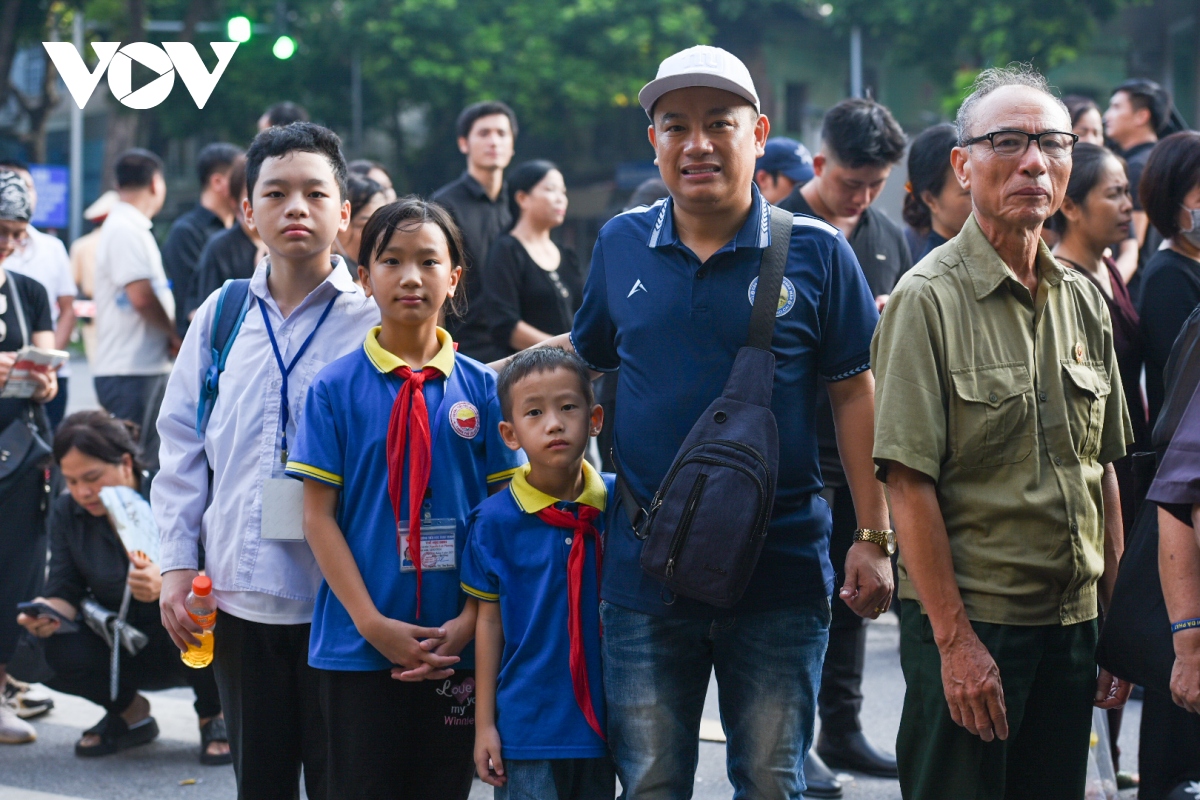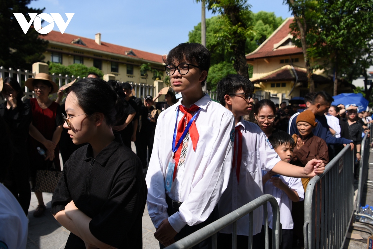 Dưới cái nắng nóng oi cả của thủ đô Hà Nội, dòng người vẫn ùn ùn kéo về Nhà Tang lễ Quốc gia - số 5 Trần Thánh Tông (Hà Nội). Em Nguyễn Trọng Minh Quang, học sinh trường THCS Tây Sơn (Hà Nội) cho biết: "Khi nghe tin Tổng Bí thư Nguyễn Phú Trọng mất, em khá buồn. Em cùng với các bạn trong đoàn vinh dự được nhà trường cử đi lễ viếng bác - người cộng sản kiên trung đã cống hiến hết sức mình vì sự phát triển của đất nước".