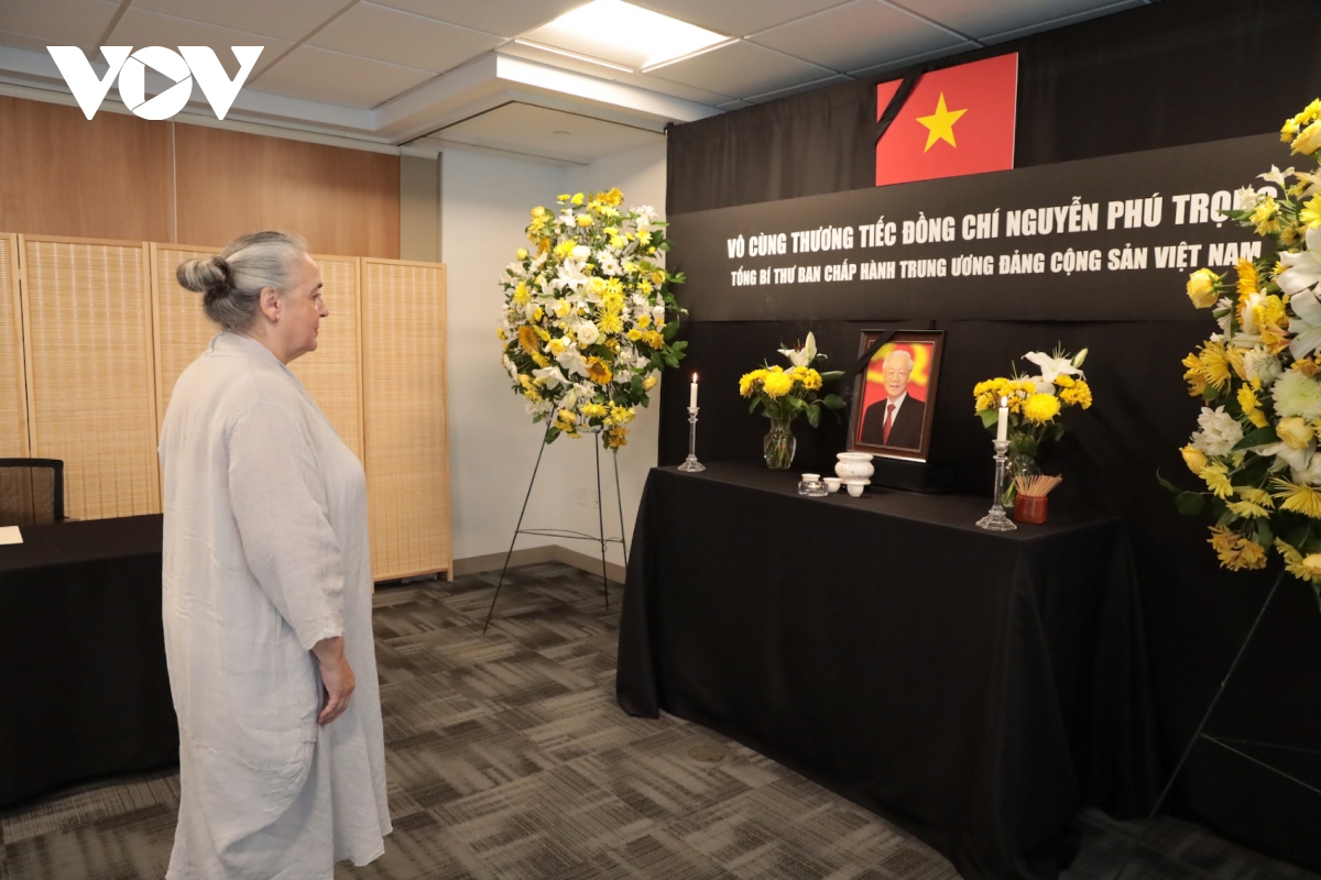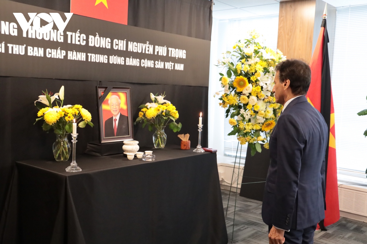 Cùng ngày, Phái đoàn Thường trực Việt Nam tại Liên Hợp Quốc đã đón tiếp hơn 50 đoàn đại biểu đến viếng, ghi Sổ tang để bày tỏ lòng thành kính, tiếc thương và tri ân Tổng Bí thư Nguyễn Phú Trọng, trong đó có nhiều Đại sứ, Đại biện các nước tại Liên Hợp Quốc, đại diện Chính quyền thành phố New York, đại diện cộng đồng người Việt, cán bộ và du học sinh Việt Nam tại New York và khu vực lân cận, Chủ tịch Đảng Cộng sản Mỹ, đại diện các phong trào cánh tả của Mỹ cùng nhiều bạn bè Mỹ thân thiết với Việt Nam.