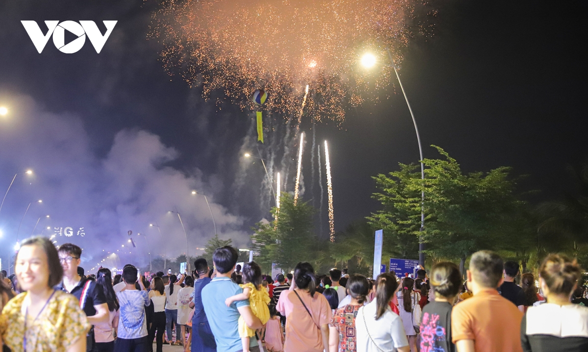 Người dân, du khách hào hứng chiêm ngưỡng pháo hoa rực sáng bên bờ vịnh Di sản.