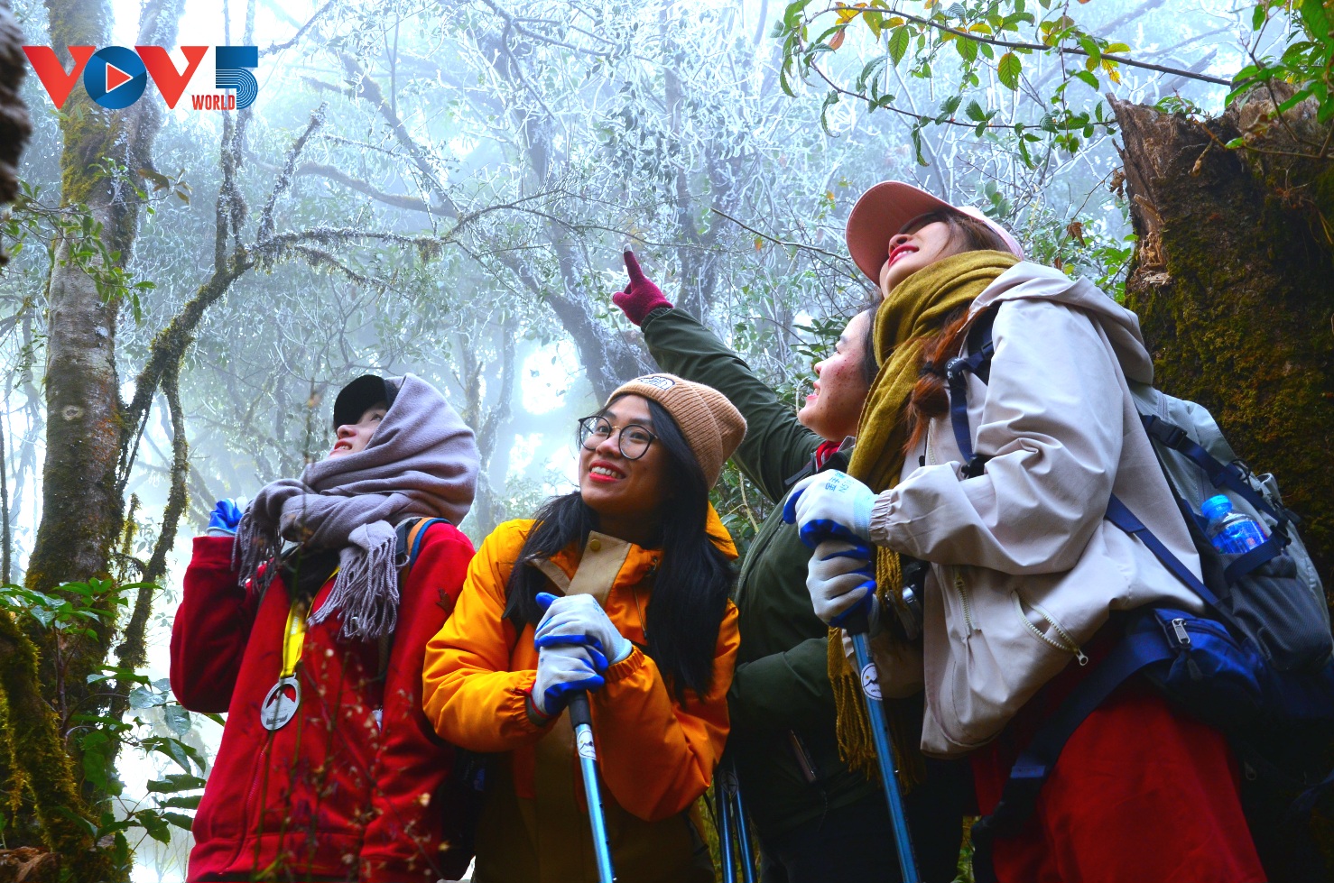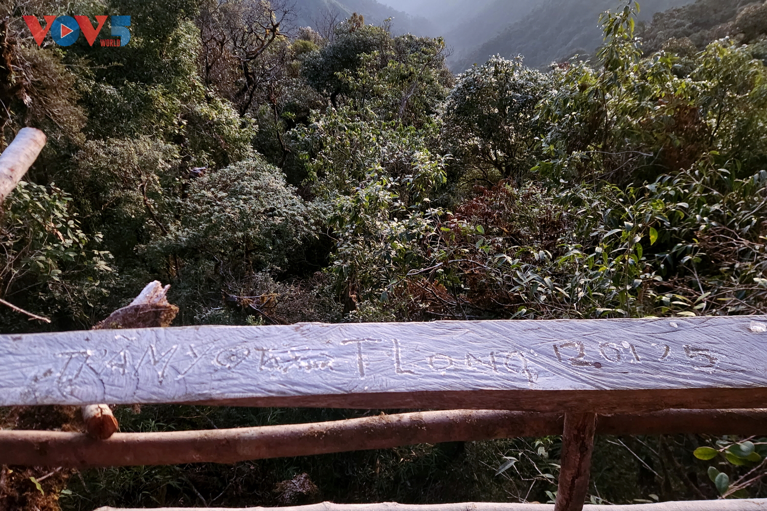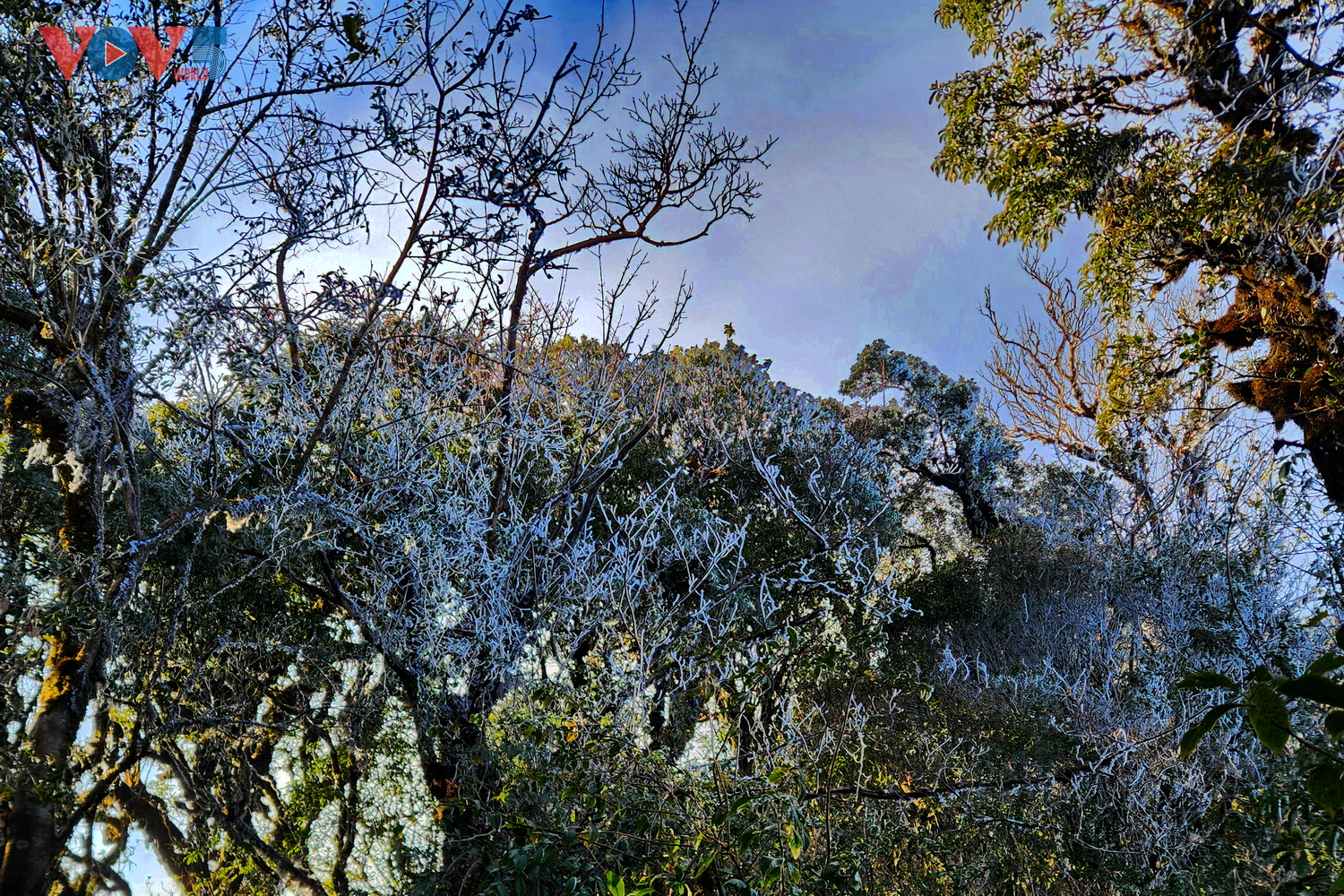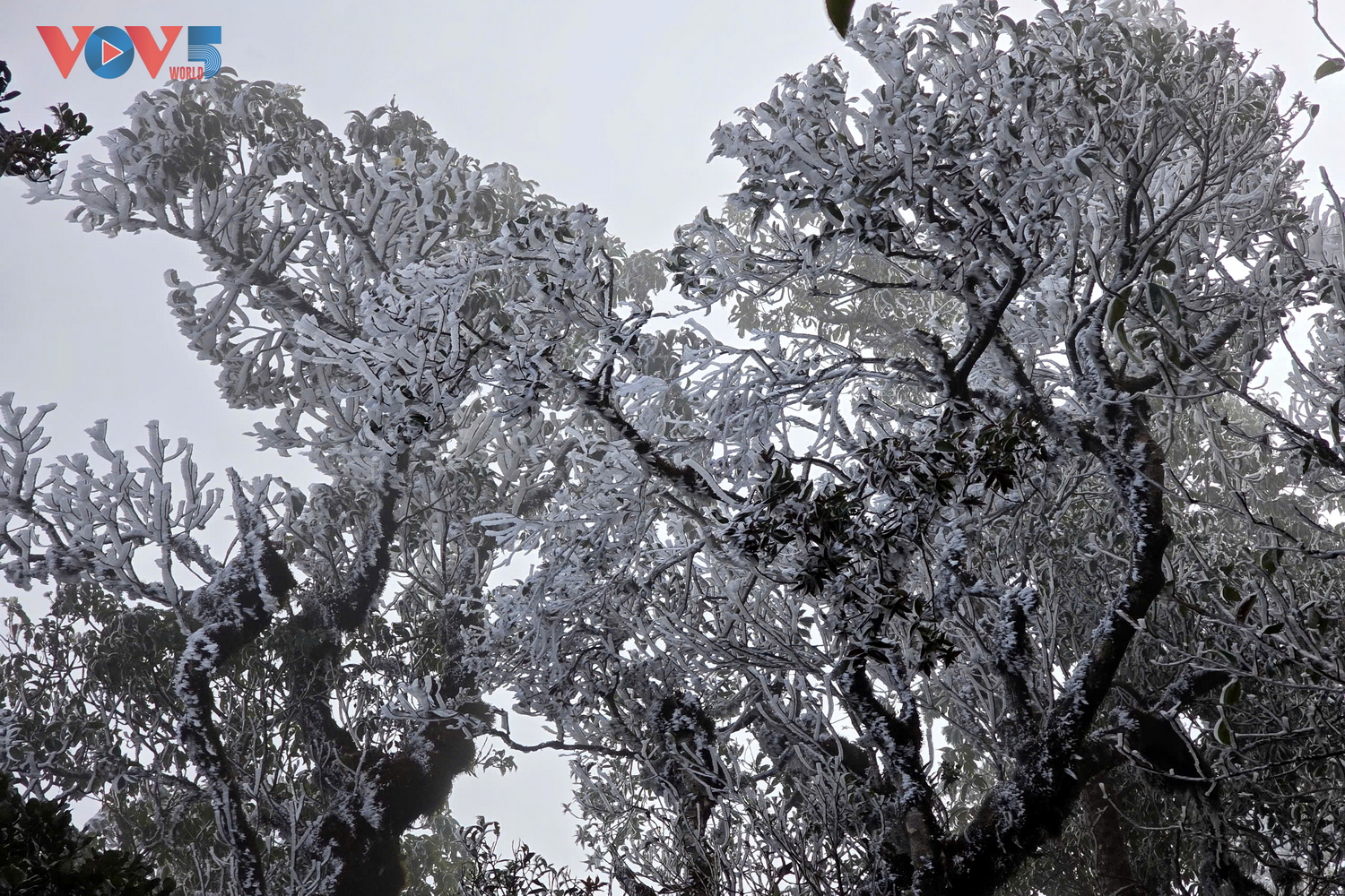 | Dọc đường trekking lên đỉnh Tà Xùa xuất hiện băng tuyết phủ kín một mảng rừng, cây cối bị đóng băng trắng xóa. |