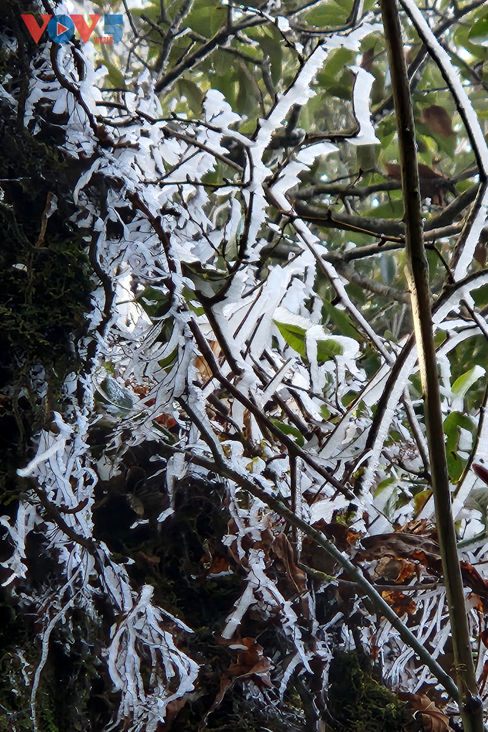 | Mặc dù vào giữa trưa nắng gắt, nhưng băng giá vẫn đóng trắng trên các cành, lá. |