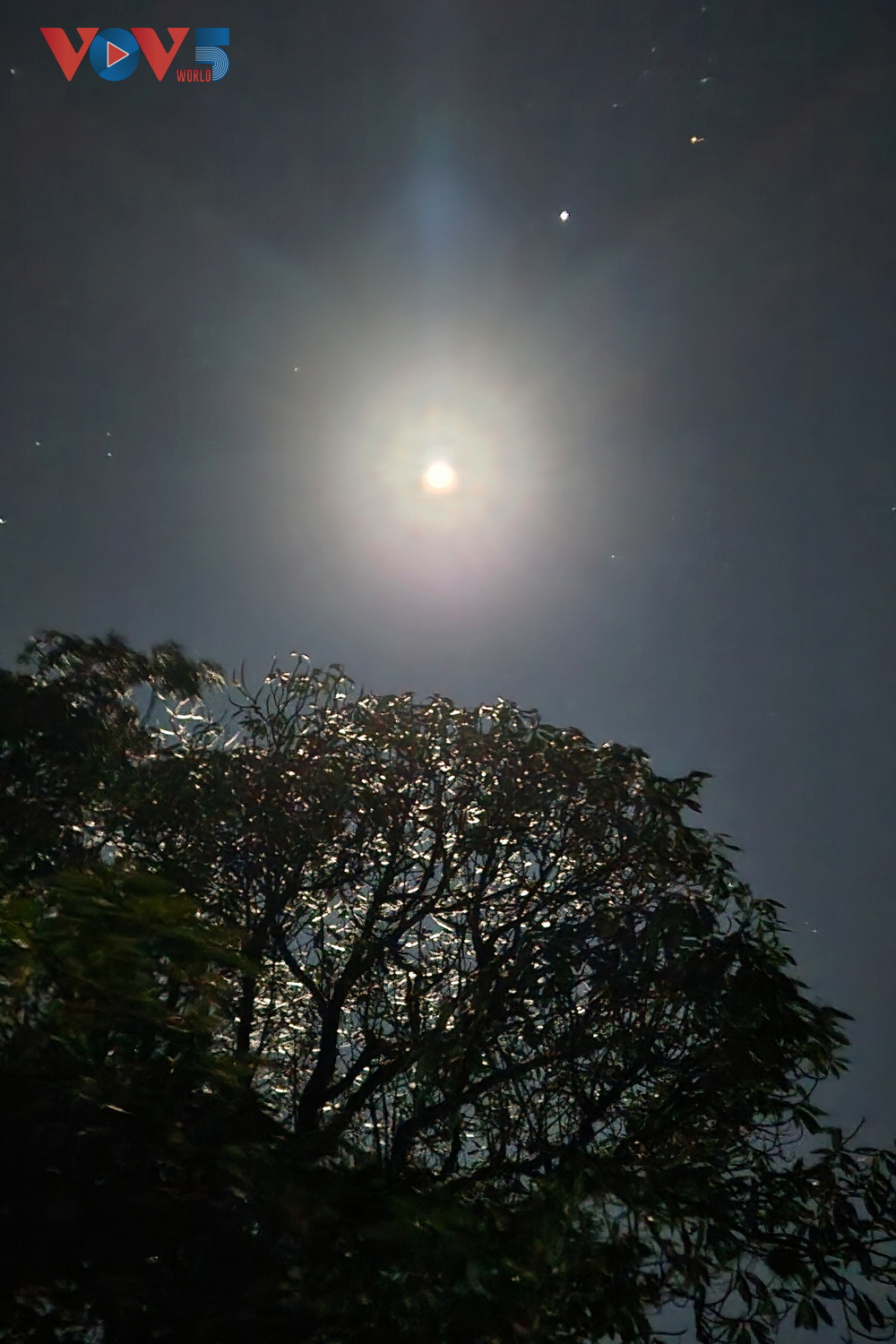 | Tại lán nghỉ, du khách có thể thấy rõ băng đóng trên những tán lá cây dưới ánh trăng sáng. |