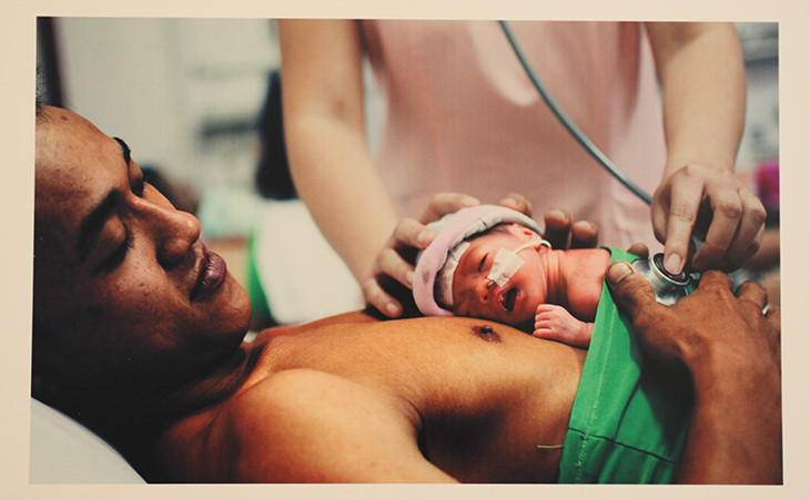 | Tác phẩm của anh thể hiện tình cảm của người cha đang thay thế người mẹ chăm sóc con sinh non. Ảnh chụp tại Bệnh viện Phụ sản Nhi Đà Nẵng. |