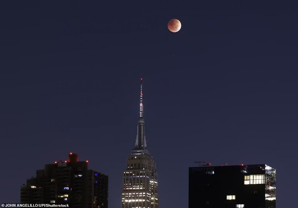 “Trăng máu hải ly” xuất hiện lúc sáng sớm ở thành phố New York, Mỹ. Ảnh: UPI |
