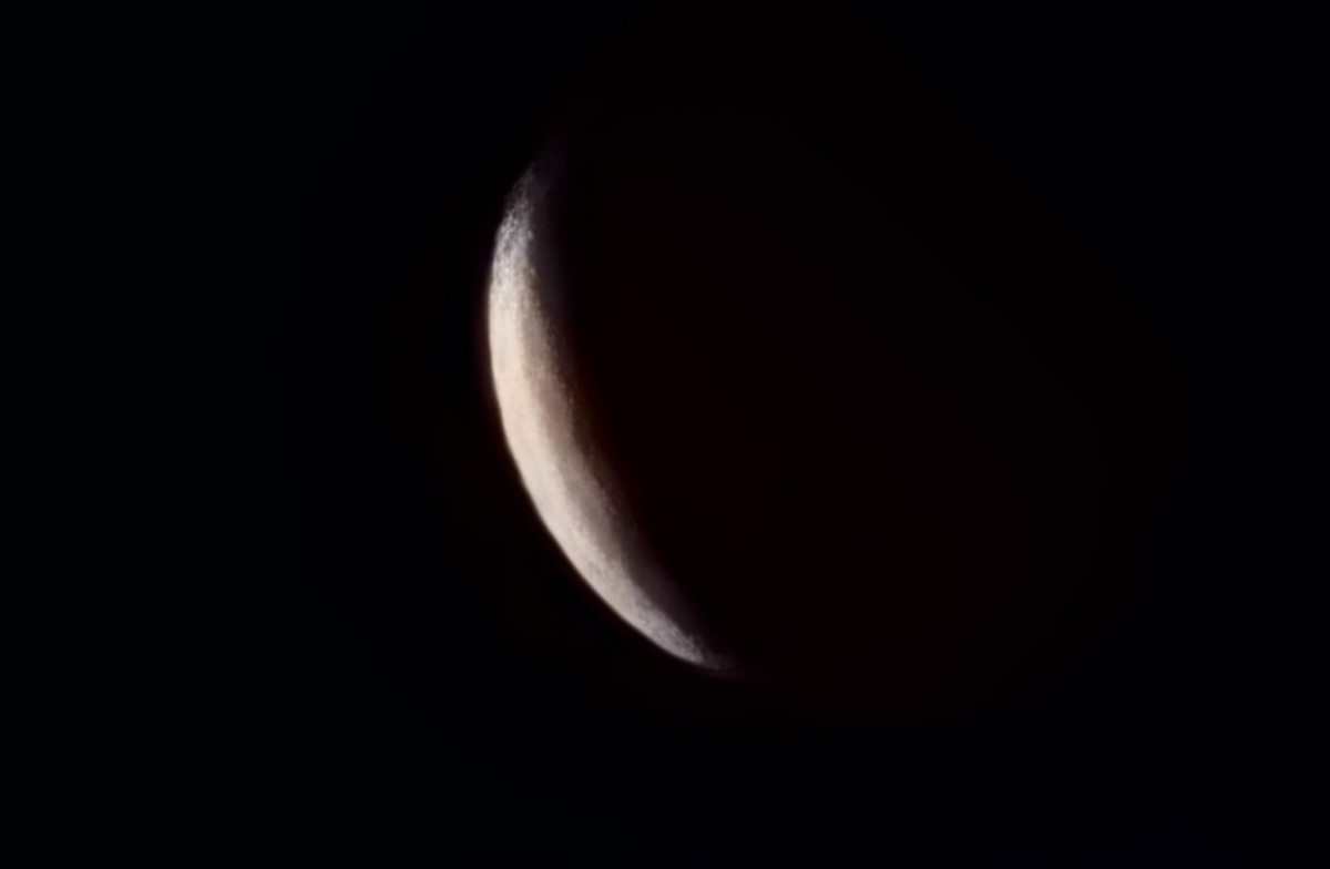 Tuy nhiên, theo ghi nhận của PV VTC News, do thời tiết không thuận lợi, bầu trời Hà Nội sương mù dày đặc nên phải đến 19h, Nguyệt thực toàn phần và “trăng máu” mới xuất hiện. Mặt Trăng quan sát qua kính thiên văn có độ bội giác 48 lần tại Đài thiên văn Hòa Lạc lúc 19h. Ảnh: VNSC |