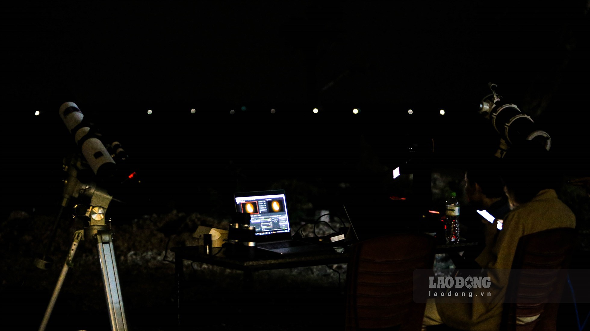 Kính thiên văn và các trang thiết bị được chuẩn bị để ghi lại những khoảnh khắc của hiện tượng nguyệt thực tại huyện Chương Mỹ, Hà Nội. Ảnh: Báo Lao động |