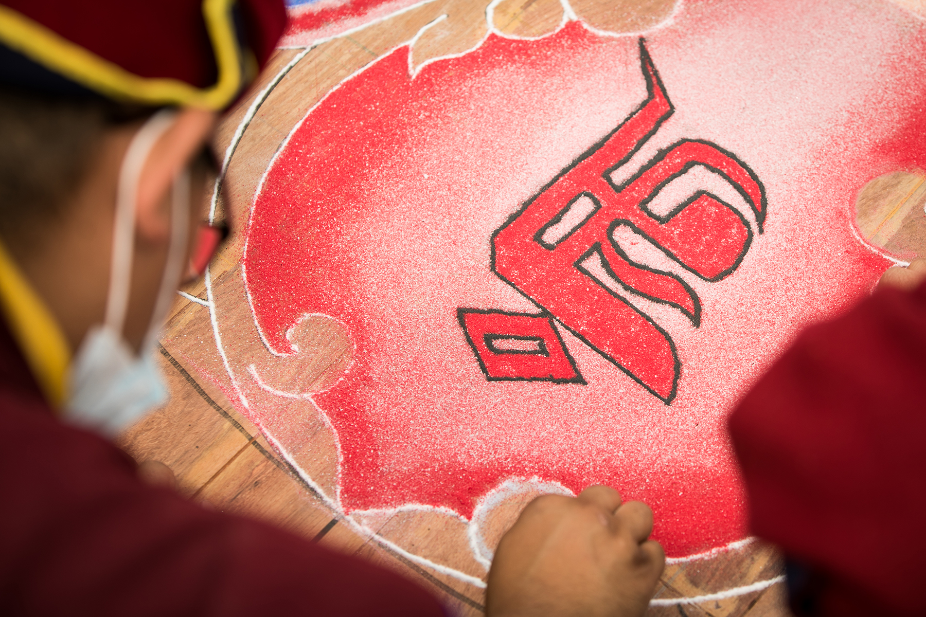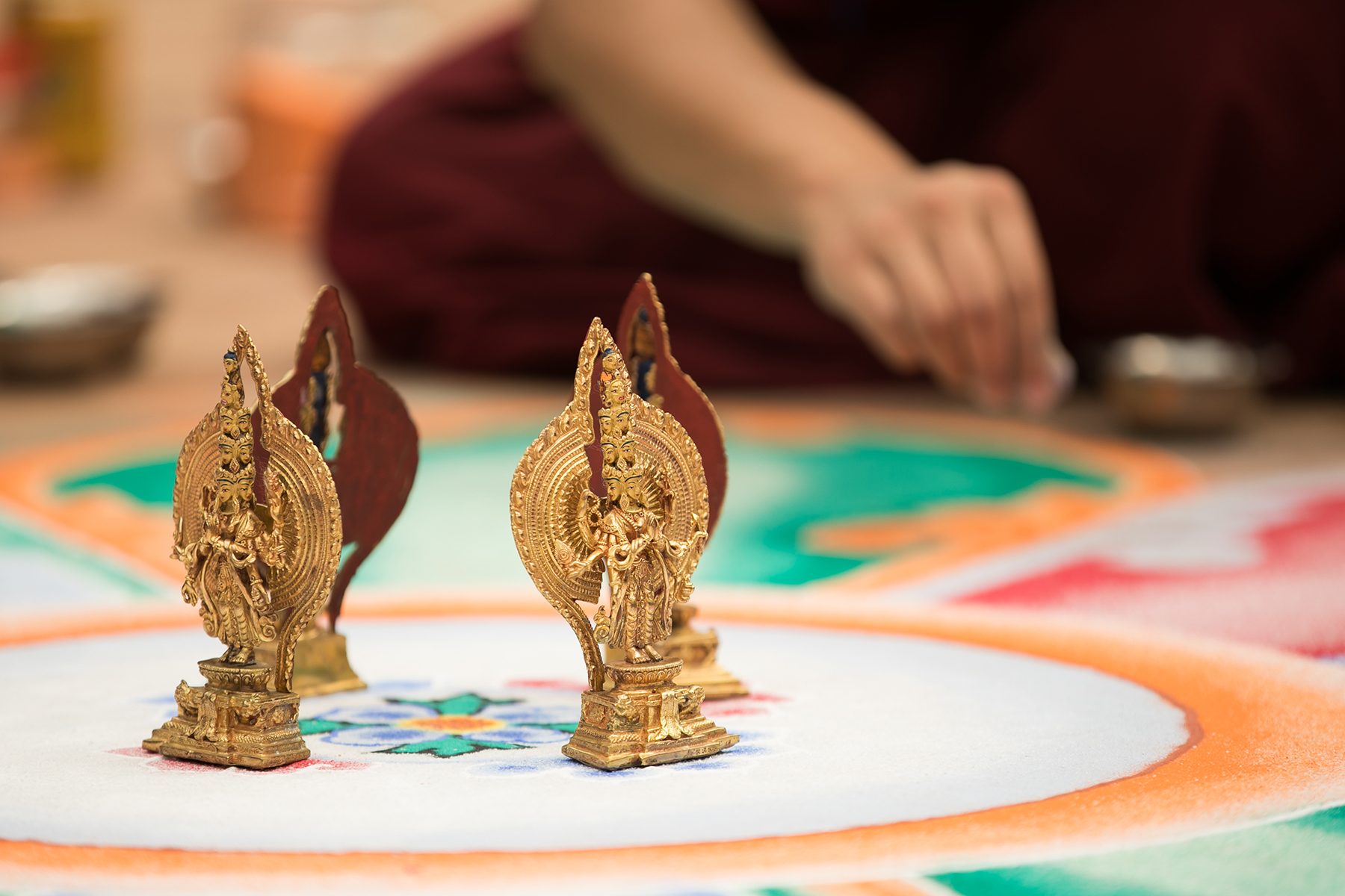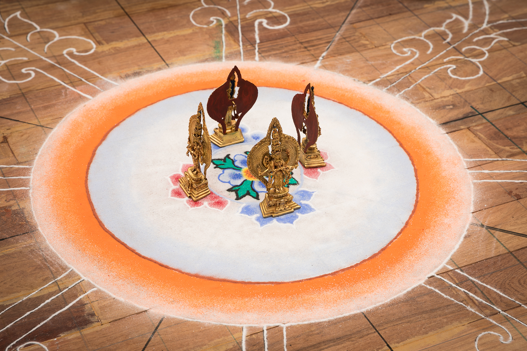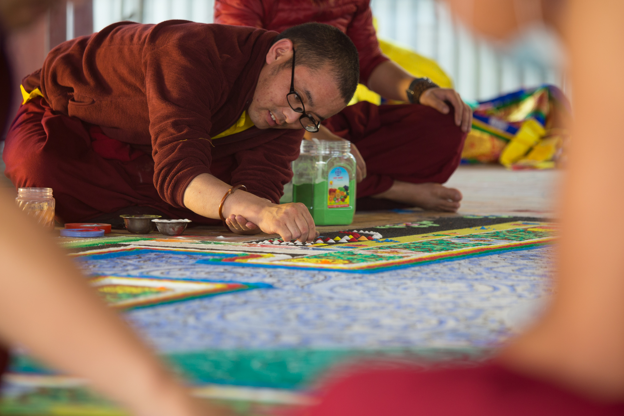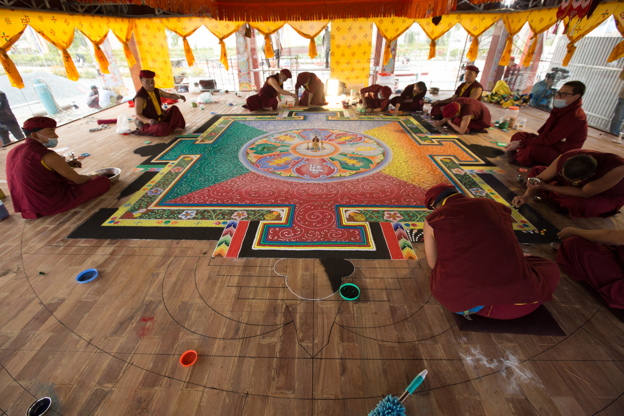 20 bậc Cao Tăng trực tiếp dùng tay rắc rải các hạt ngọc đá quý lên đồ hình Đại Mandala để vừa lưu giữ vừa truyền năng lượng. |