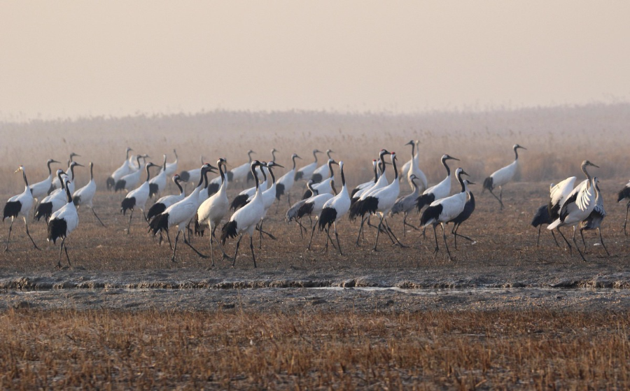 Khu vực bãi lầy triều bên bờ biển Hoàng Hải, vịnh Bột Hải là môi trường sống của nhiều loài cá và động vật giáp xác. Đây cũng là điểm tập trung của các loài chim di cư trên đường bay Đông Á – Australia. Những đàn chim lớn, bao gồm cả các loài có nguy cơ tuyệt chủng cao, đều đến bờ biển để nghỉ ngơi, thay lông, trú đông và làm tổ. Ảnh: Xinhua.