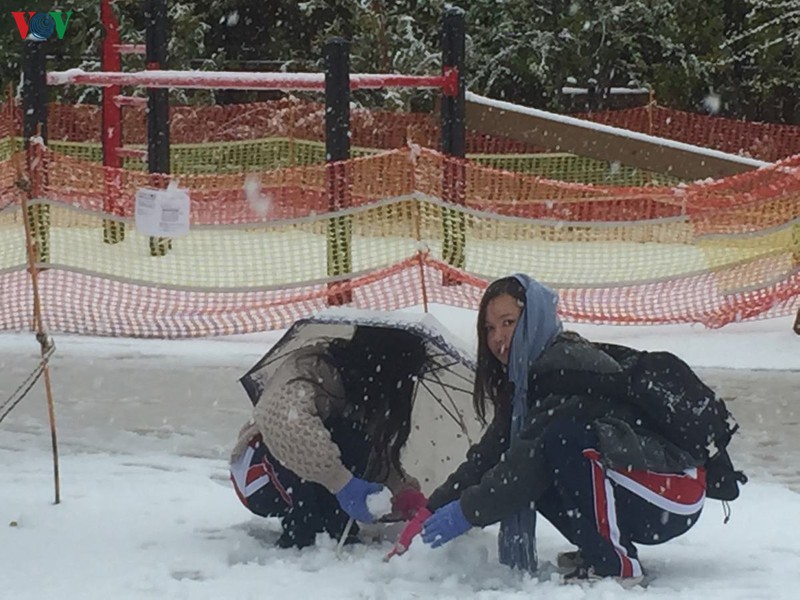 Nhiều bạn trẻ vẫn ra thưởng thức tuyết rơi trong mùa xuân.