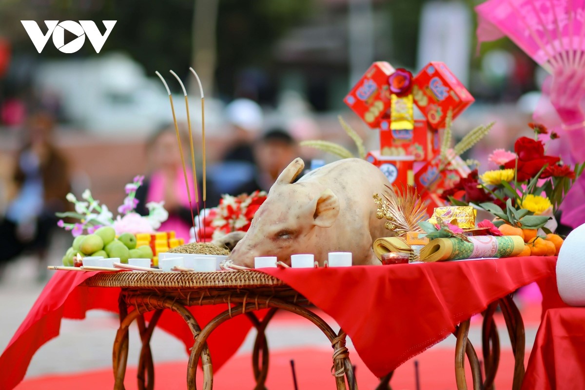 Trên bờ, một mâm lễ lớn với đầy đủ vật hiến sinh (lợn, gà), đồ tế lễ (xôi, hương hoa, trái cây, rượu gạo… ) được chuẩn bị sẵn. |