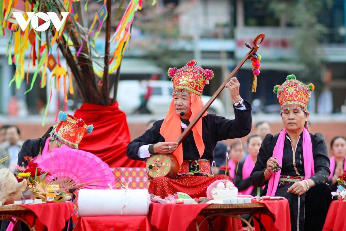 Thầy cúng cùng 2 người giúp việc và 12 thiếu nữ mặc trang phục truyền thống bắt đầu lễ bái, khấn nguyện. |