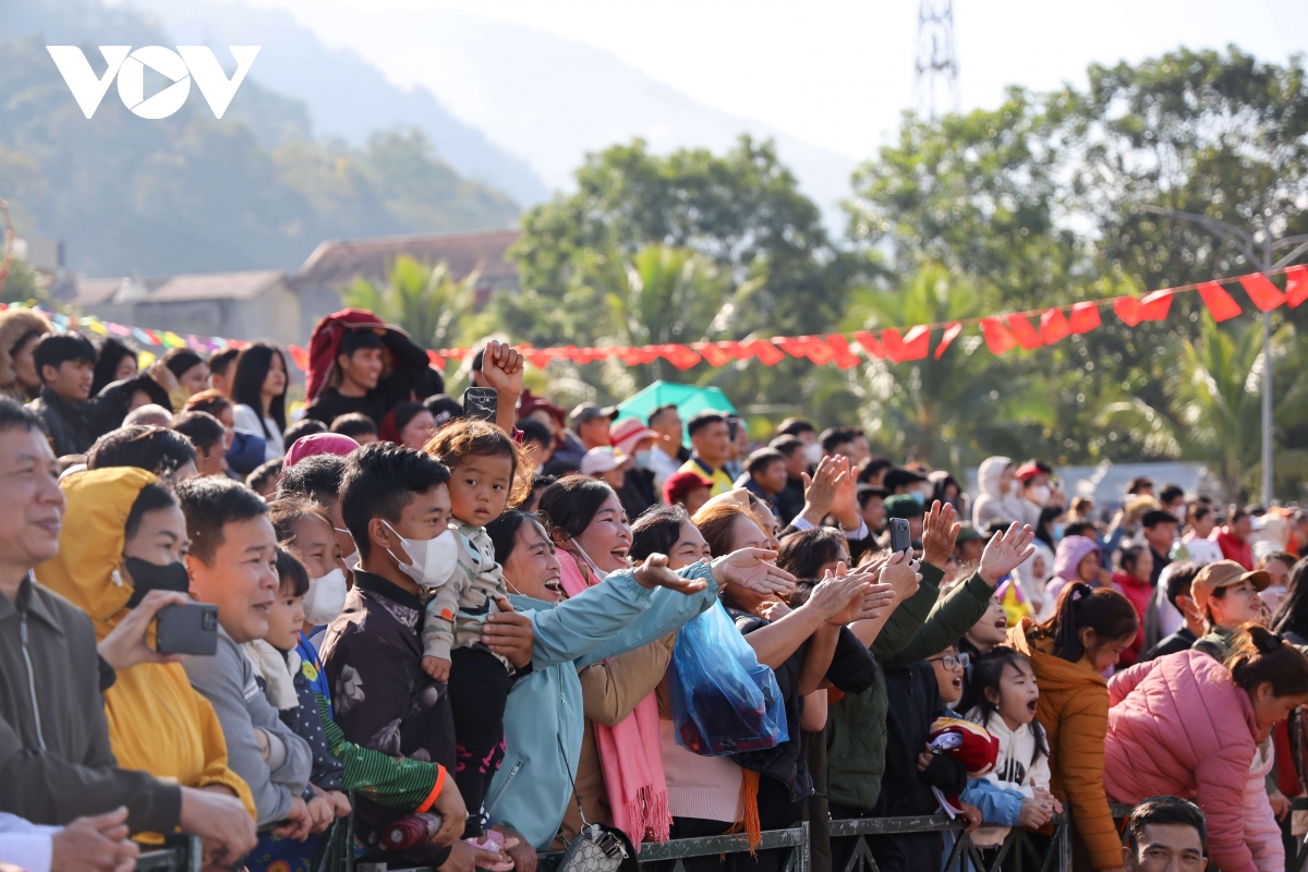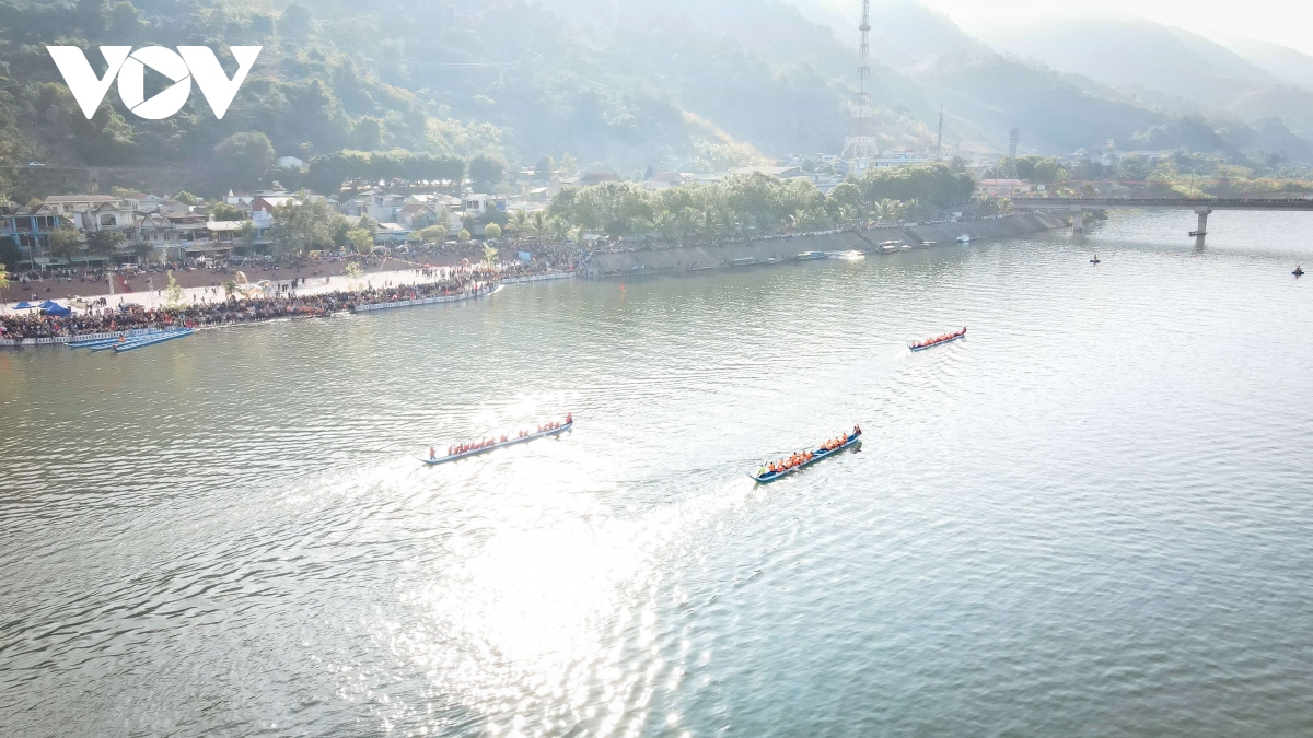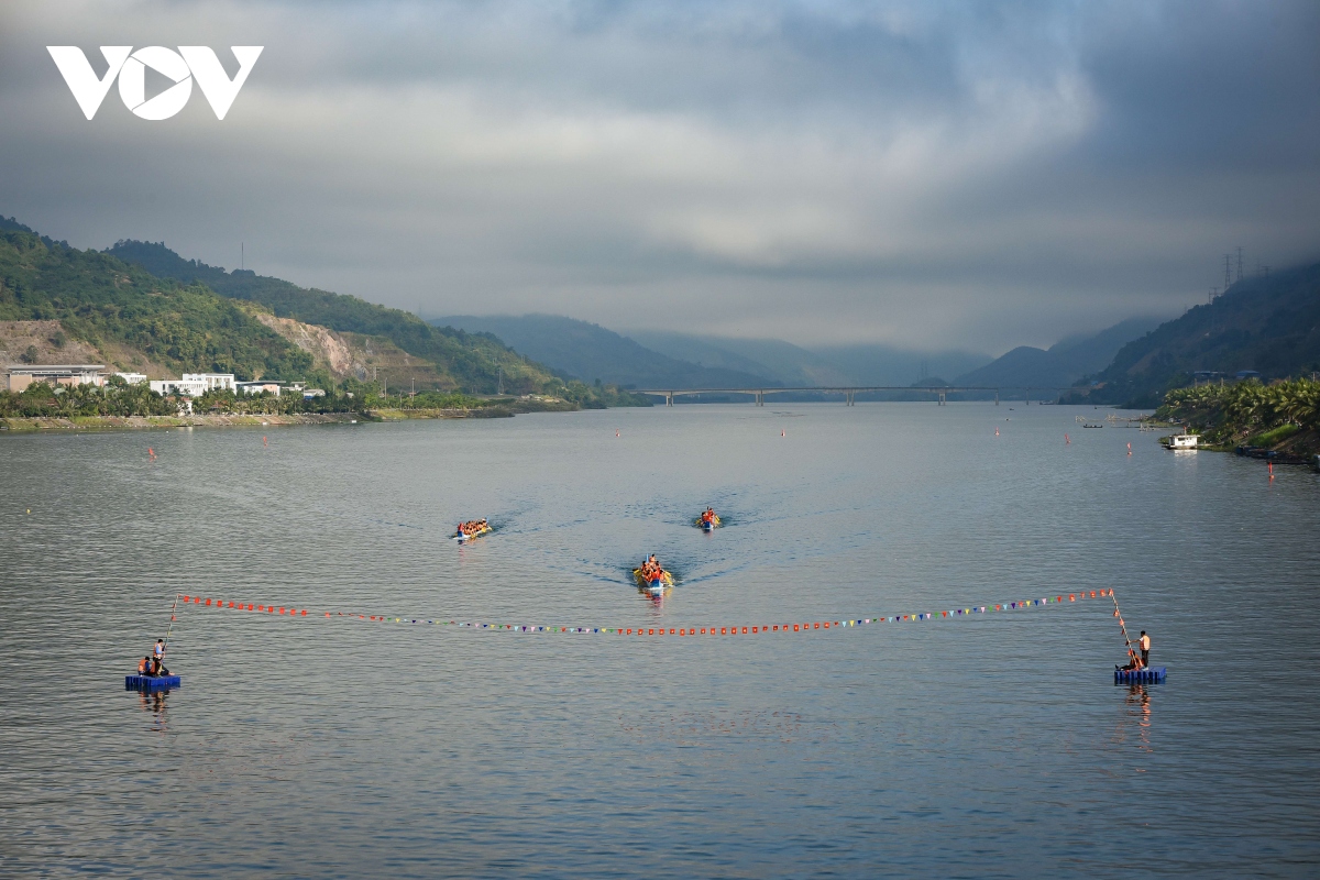 Suốt hành trình đua, các đội đua liên tục nhận được sự cổ vũ, reo hò nhiệt tình của đông đảo người dân đứng hai bên bờ lòng hồ cùng tiếng chiêng, trống vang vọng khắp các bản làng. |