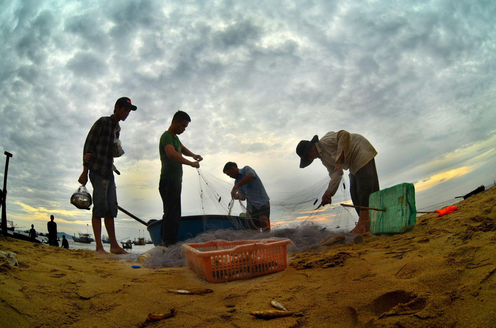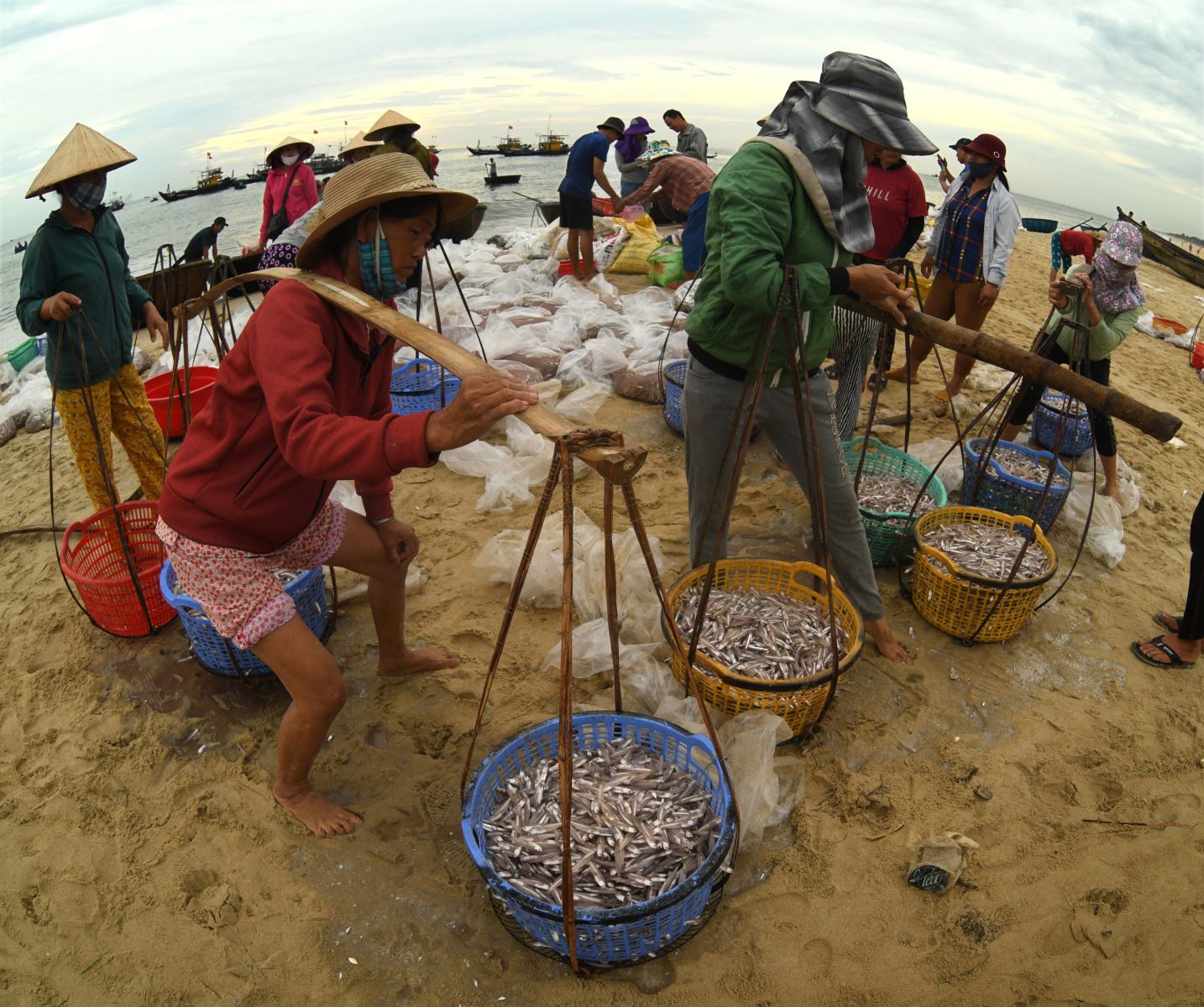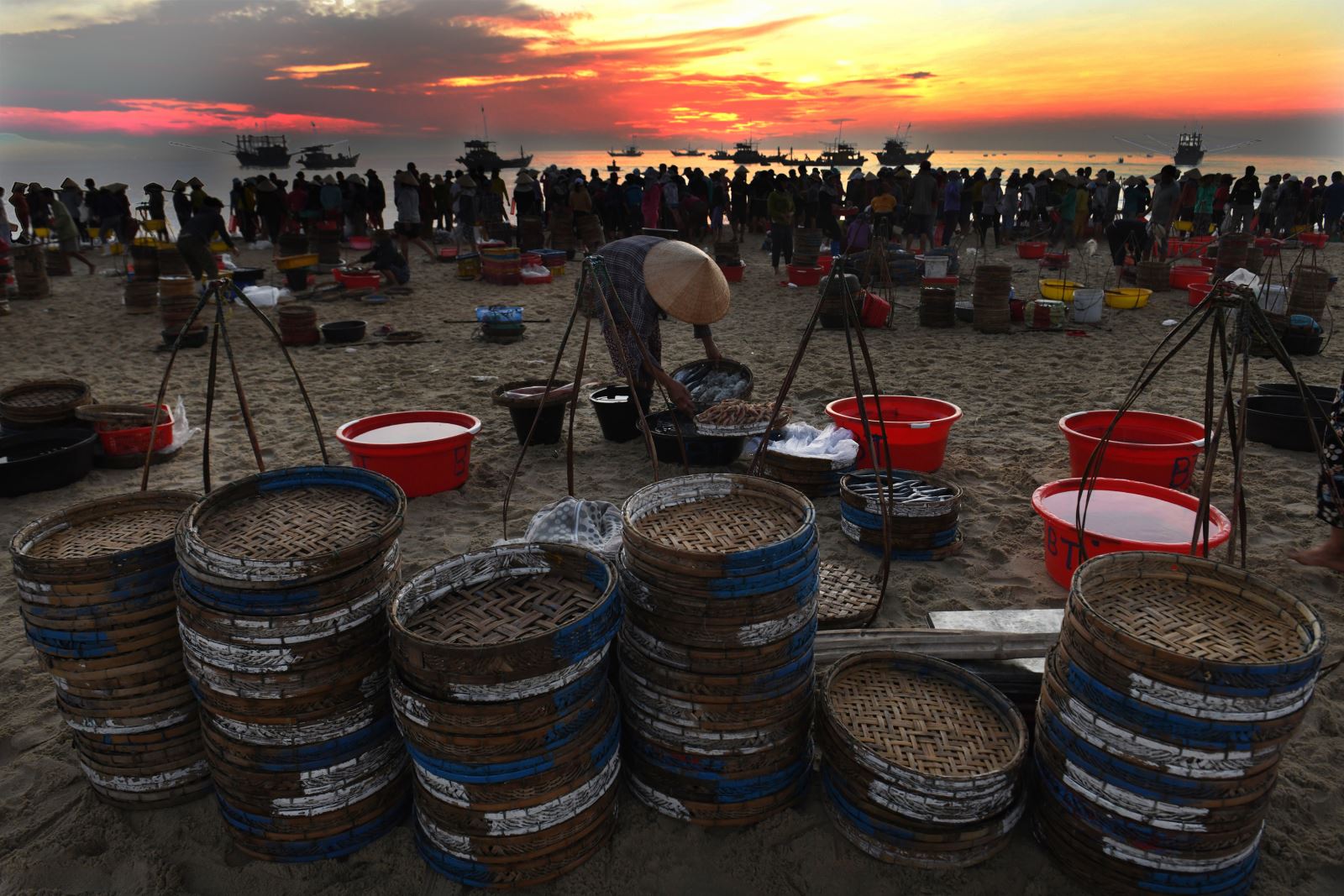 Đây là lần đầu tiên tôi đến chợ cá Bình Minh ở huyện Thăng Bình, tỉnh Quảng Nam. Từ sáng sớm, không khí đã vô cùng tấp nập khi những đoàn thuyền đánh bắt hải sản cập bến. Trên bờ, hàng trăm phụ nữ là những người gánh cá thuê, tiểu thương và người nhà của các ngư dân đang chờ sẵn. Quang cảnh thật ấn tượng khi nắng lên, những người phụ nữ với gánh cá nặng trĩu, đi như chạy trên bãi biển, vận chuyển cá đi khắp nơi, bóng đổ dài trên cát. Thuyền thúng ở đây có rất nhiều, chủ yếu là để chuyển cá từ tàu to vào bờ. Đôi khi ngư dân cũng dùng thuyền thúng để đánh cá ven bờ.