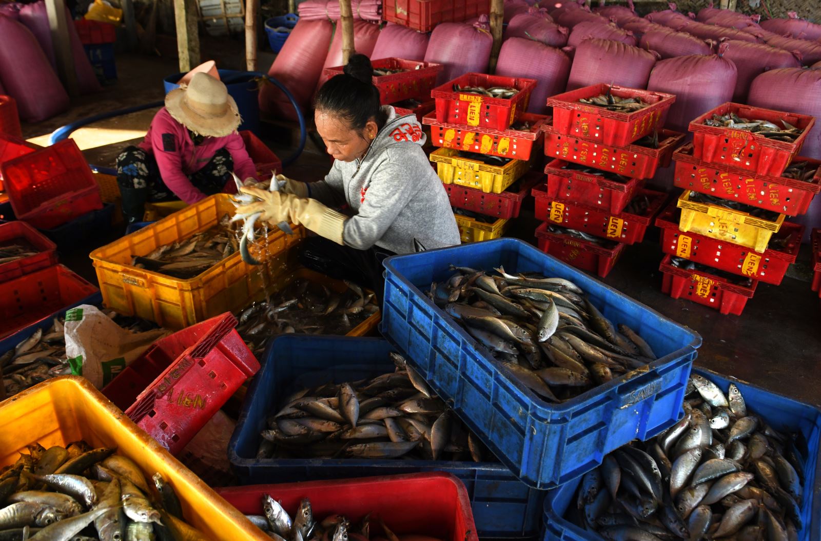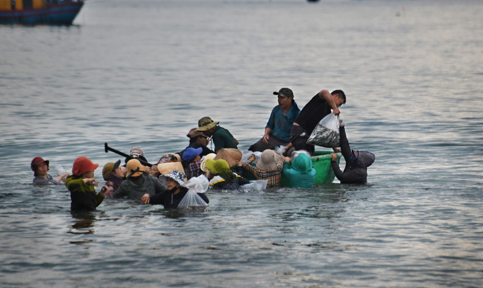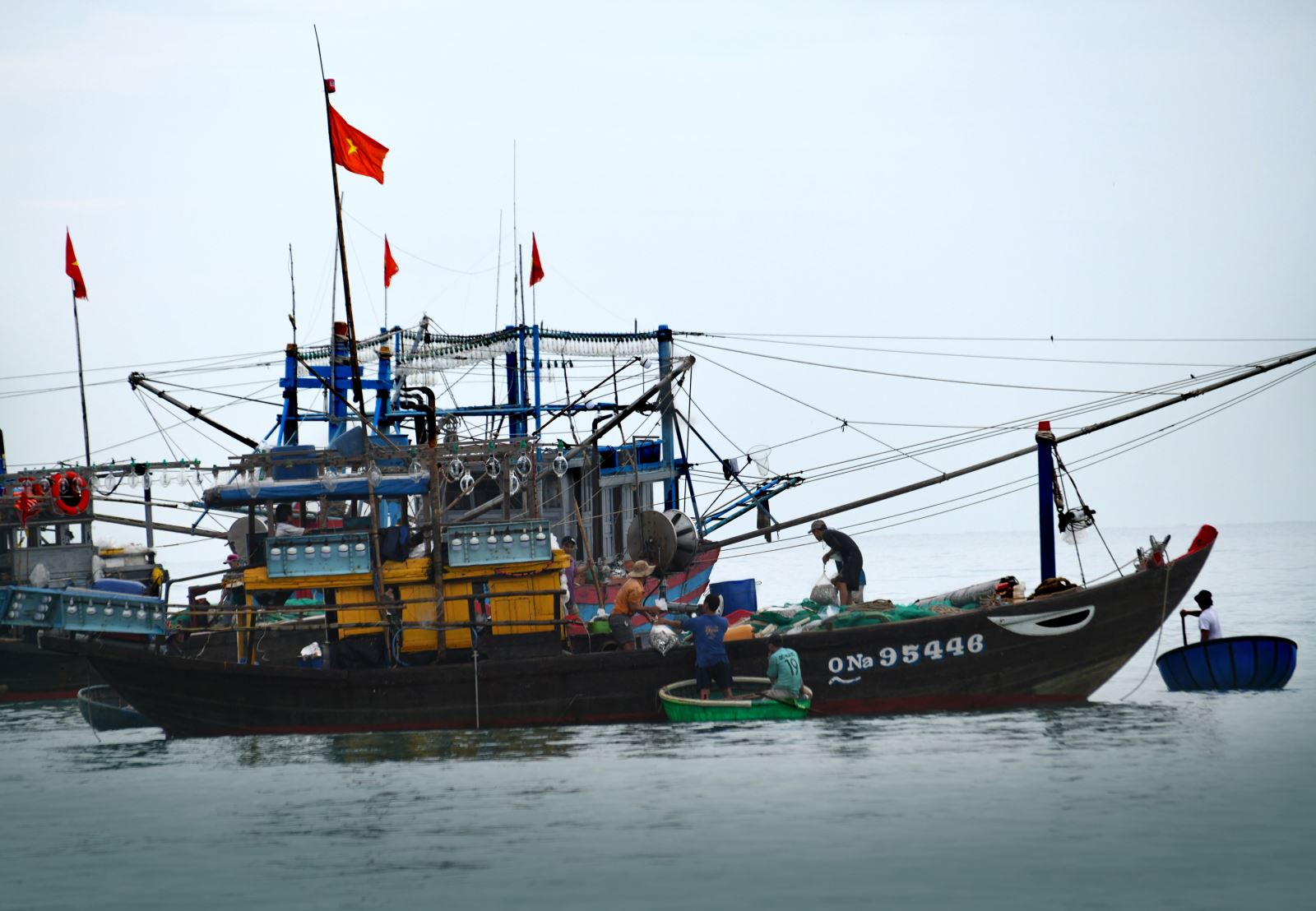 Đây là lần đầu tiên tôi đến chợ cá Bình Minh ở huyện Thăng Bình, tỉnh Quảng Nam. Từ sáng sớm, không khí đã vô cùng tấp nập khi những đoàn thuyền đánh bắt hải sản cập bến. Trên bờ, hàng trăm phụ nữ là những người gánh cá thuê, tiểu thương và người nhà của các ngư dân đang chờ sẵn. Quang cảnh thật ấn tượng khi nắng lên, những người phụ nữ với gánh cá nặng trĩu, đi như chạy trên bãi biển, vận chuyển cá đi khắp nơi, bóng đổ dài trên cát. Thuyền thúng ở đây có rất nhiều, chủ yếu là để chuyển cá từ tàu to vào bờ. Đôi khi ngư dân cũng dùng thuyền thúng để đánh cá ven bờ.
