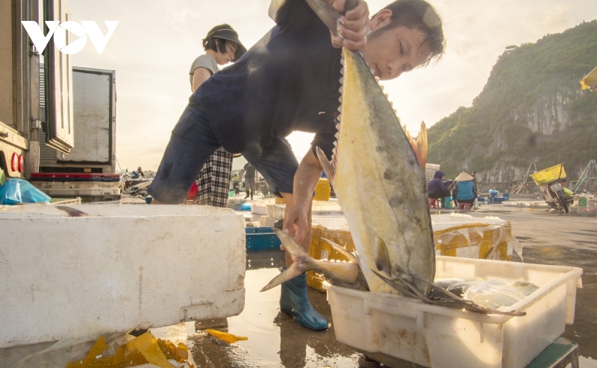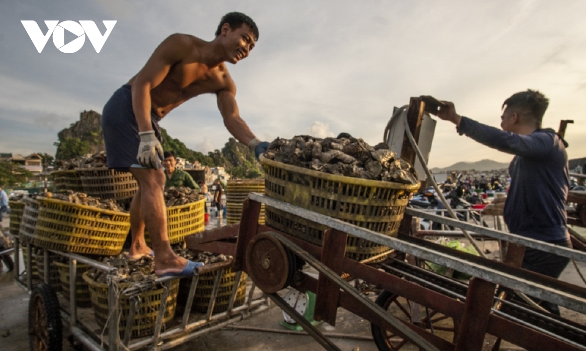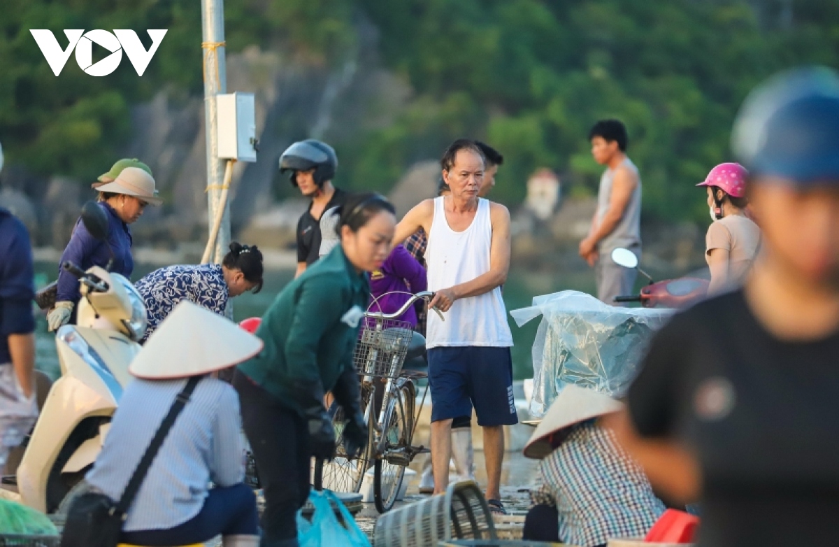 Ngày mới bắt đầu cũng là lúc ngư dân trên vịnh Bái Tử Long kết thúc chuyến ra khơi đêm, đưa những sản vật của biển vừa khai thác, thu hoạch sau nuôi trồng vào bến cảng Cái Rồng, thị trấn Cái Rồng, huyện đảo Vân Đồn, Quảng Ninh. |