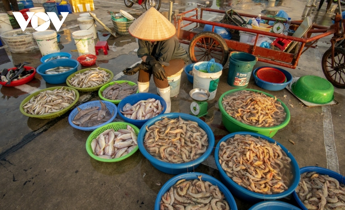 Sau khi thuyền to, thuyền nhỏ tấp nập cập bờ, ngư dân phân loại hải sản và mang lên chợ, hoặc tiểu thương xuống tận nơi để mua. |