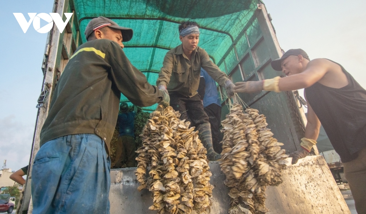 Hàu cũng là loại hải sản đặc trưng tại Cái Rồng. Từ các vùng nuôi trên vịnh, ngư dân chở tàu vào rồi dùng băng tải vận chuyển lên bến. |