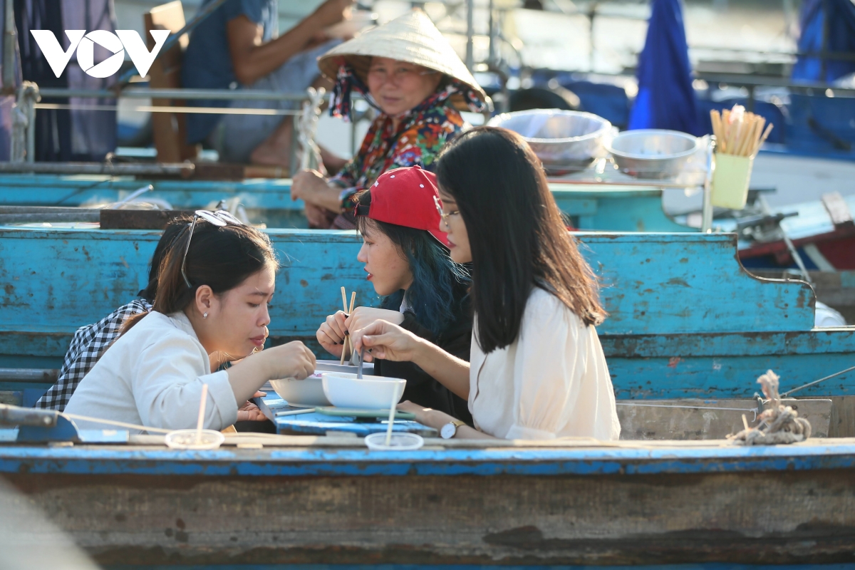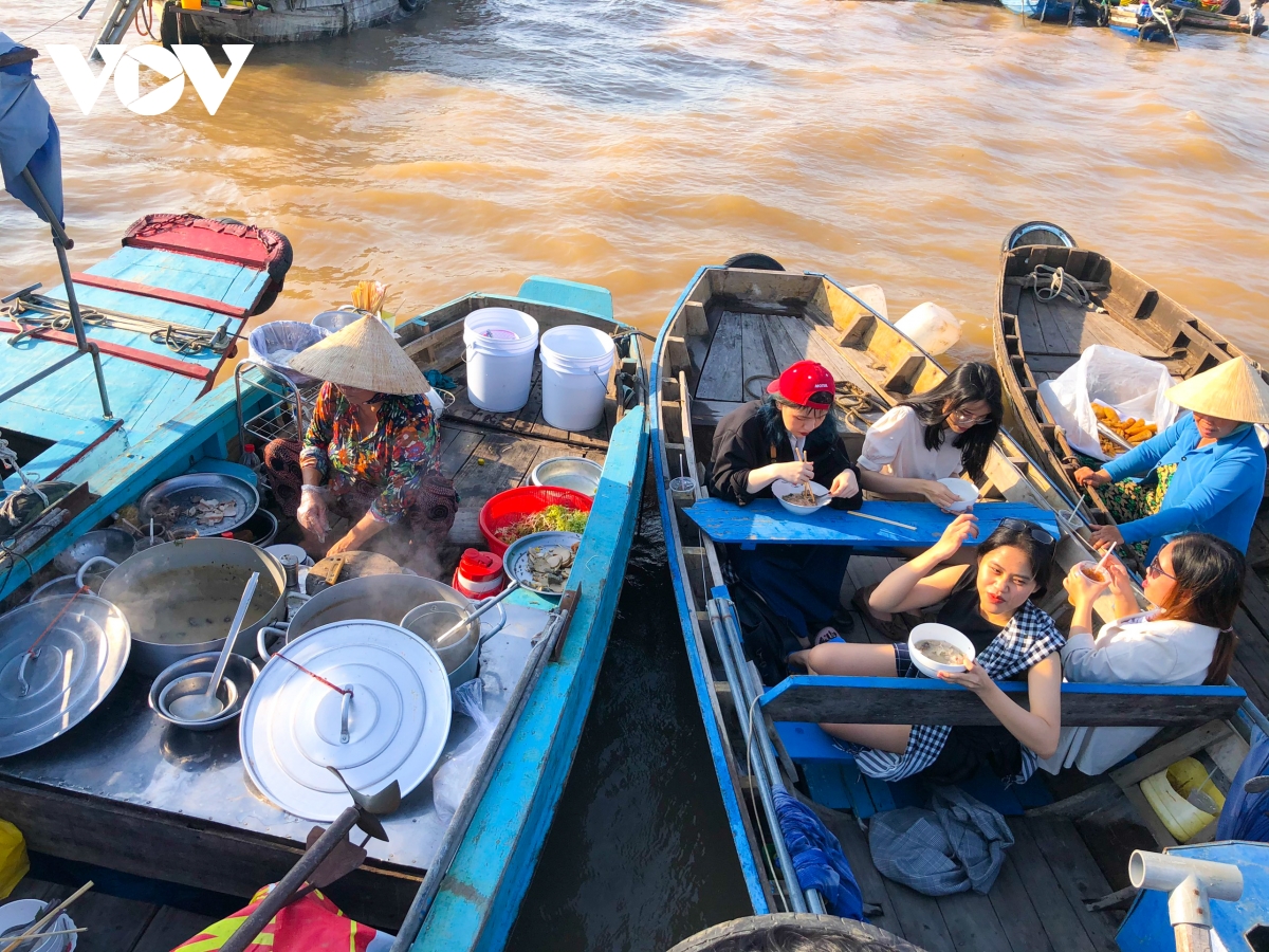 | Đến chợ nổi du khách không chỉ tham quan các xuồng trái cây, nông sản mà còn được trải nghiệm các món phở, món nhậu, hủ tiếu, cà phê ngay trên thuyền. |