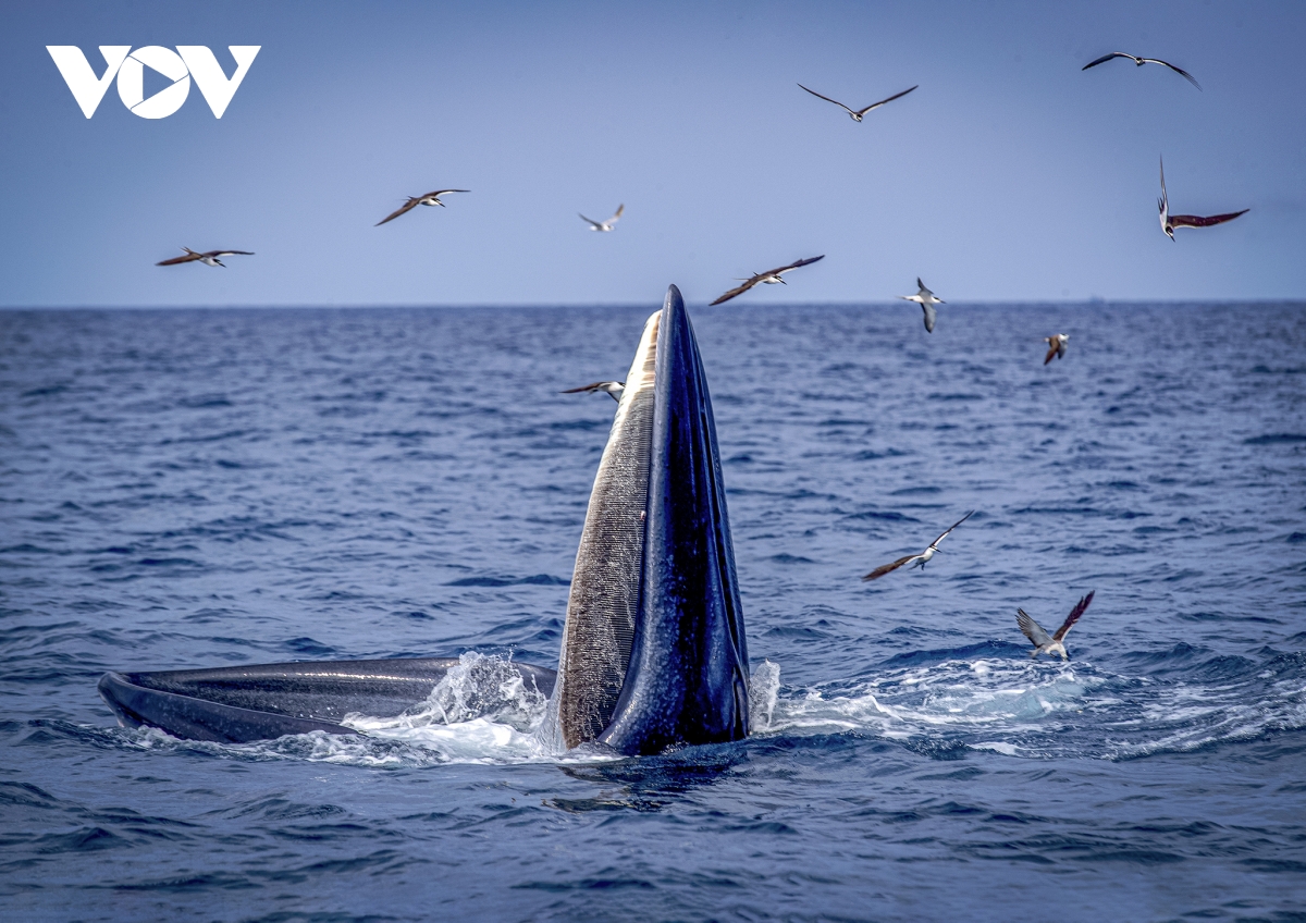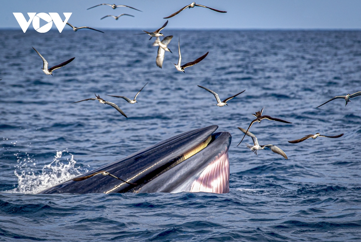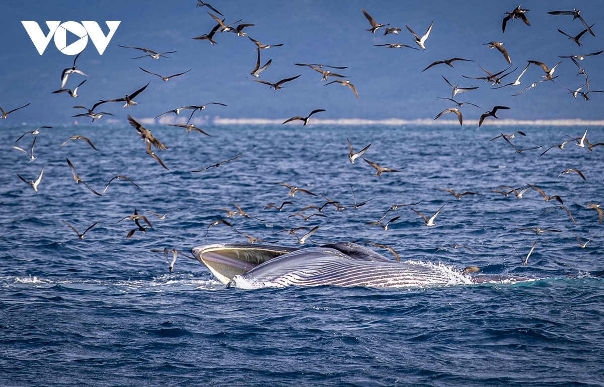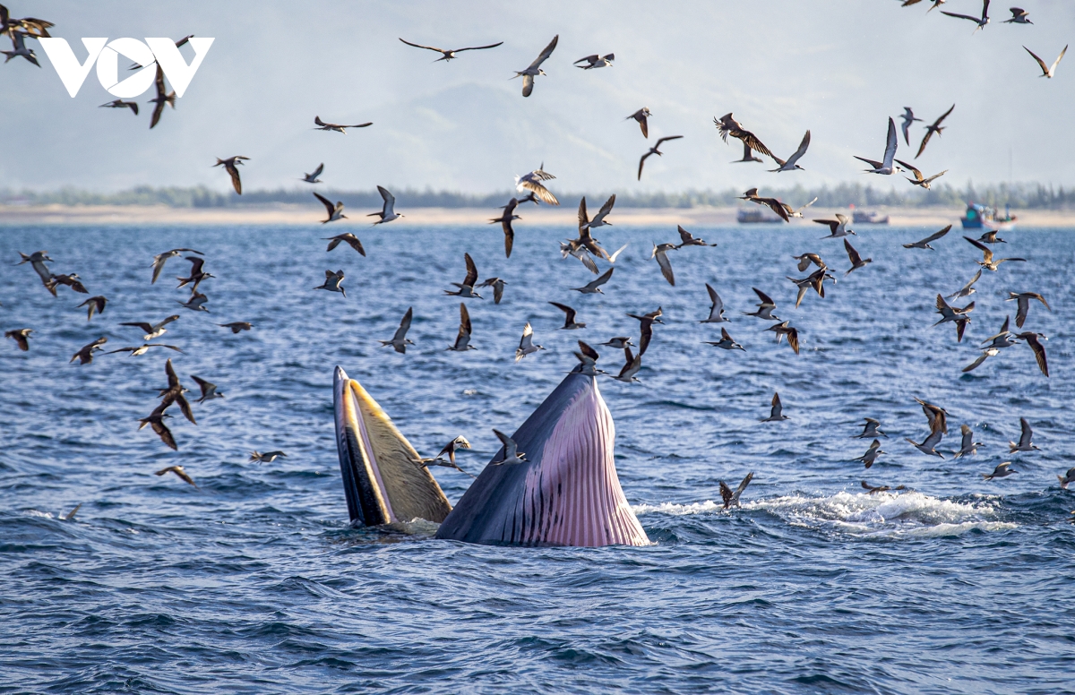 Cá voi kiếm ăn gần bờ, bơi đuổi theo và há mồm nuốt gọn đàn cá Giò. Ngay trên đầu là hàng trăm chim con hải âu bay theo để "ăn ké".