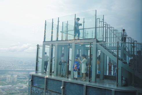 Vừa bước chân ra khỏi thang máy, khách thăm quan sẽ choáng ngợp trước khung cảnh như bay giữa lưng chừng trời của Đài quan sát. Toàn bộ khu vực Landmark 81 SkyView được phủ kính cường lực trong suốt, mang đến tầm nhìn hoàn toàn rộng mở “có một không hai” tại TP.HCM.