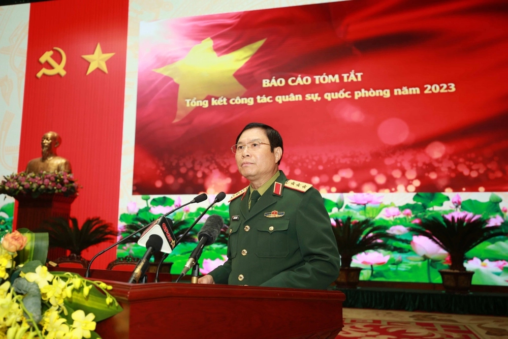 Thượng tướng Nguyễn Tân Cương, Ủy viên Trung ương Đảng, Ủy viên Thường vụ Quân ủy Trung ương, Tổng Tham mưu trưởng Quân đội nhân dân Việt Nam, Thứ trưởng Bộ Quốc phòng trình bày báo cáo kết quả thực hiện nhiệm năm 2023 tại hội nghị.
