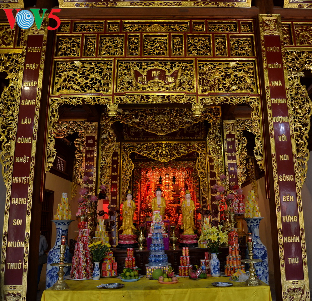 | Đôi câu đối: (bên phải) Chúc nước nhà thịnh vượng với núi sông bền vững nghìn thu; (bên trái) Khen Phật pháp sáng lâu cùng nhật nguyệt rạng soi muôn thuở. |