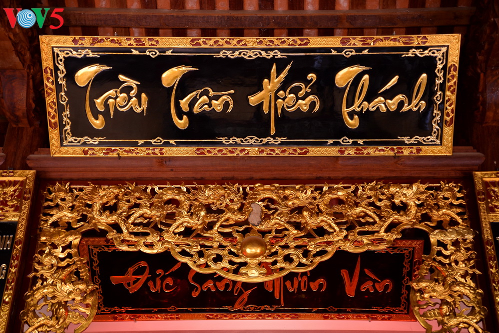 | Hai bức hoành phi viết bằng thư pháp Việt: "Triều Trần Hiển Thánh" và "Đức Sáng muôn vàn" ca ngợi công lao của Trần triều. |