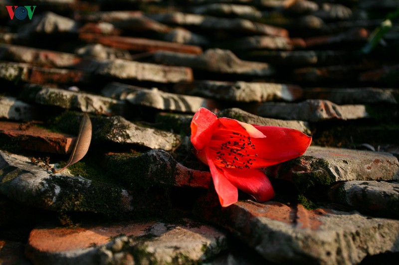 Hoa rụng trên mái cầu cổ “Nhật Tiên Kiều” như một dấu lặng gợi chút bâng khuâng.