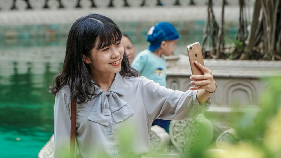 Giới trẻ thích thú chụp ảnh trước hồ nước xanh