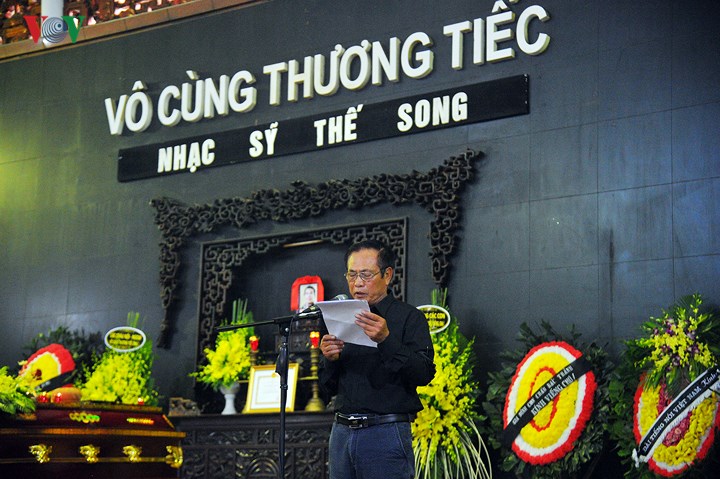 | Nhạc sĩ Bá Môn, Chánh Văn phòng Hội Âm nhạc Hà Nội nghẹn ngào đọc điếu văn nhạc sĩ Thế Song: "Những tác phẩm của ông sẽ sống mãi với đất nước và hàng triệu người yêu nhạc, yêu con người ông – một nhạc sĩ Thế Song: tài hoa, đức độ, khiêm nhường và thanh liêm". |