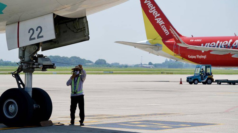 Nhân viên làm việc trong khu bay phải trang bị kín mít để chống chọi với cái nắng thiêu đốt.