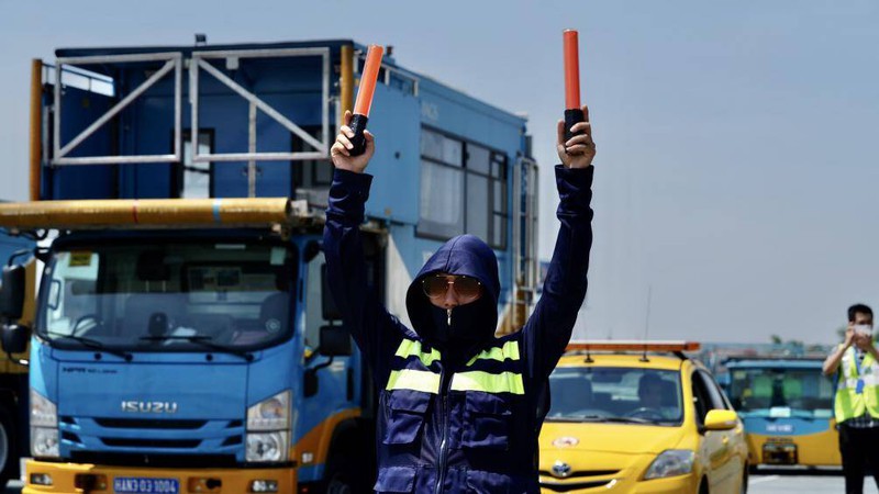 Các nhân viên hàng không tại sân bay Nội Bài (Hà Nội) vẫn nỗ lực làm việc dưới thời tiết nắng gắt và nền bê tông hấp thụ nhiệt trên diện rộng.