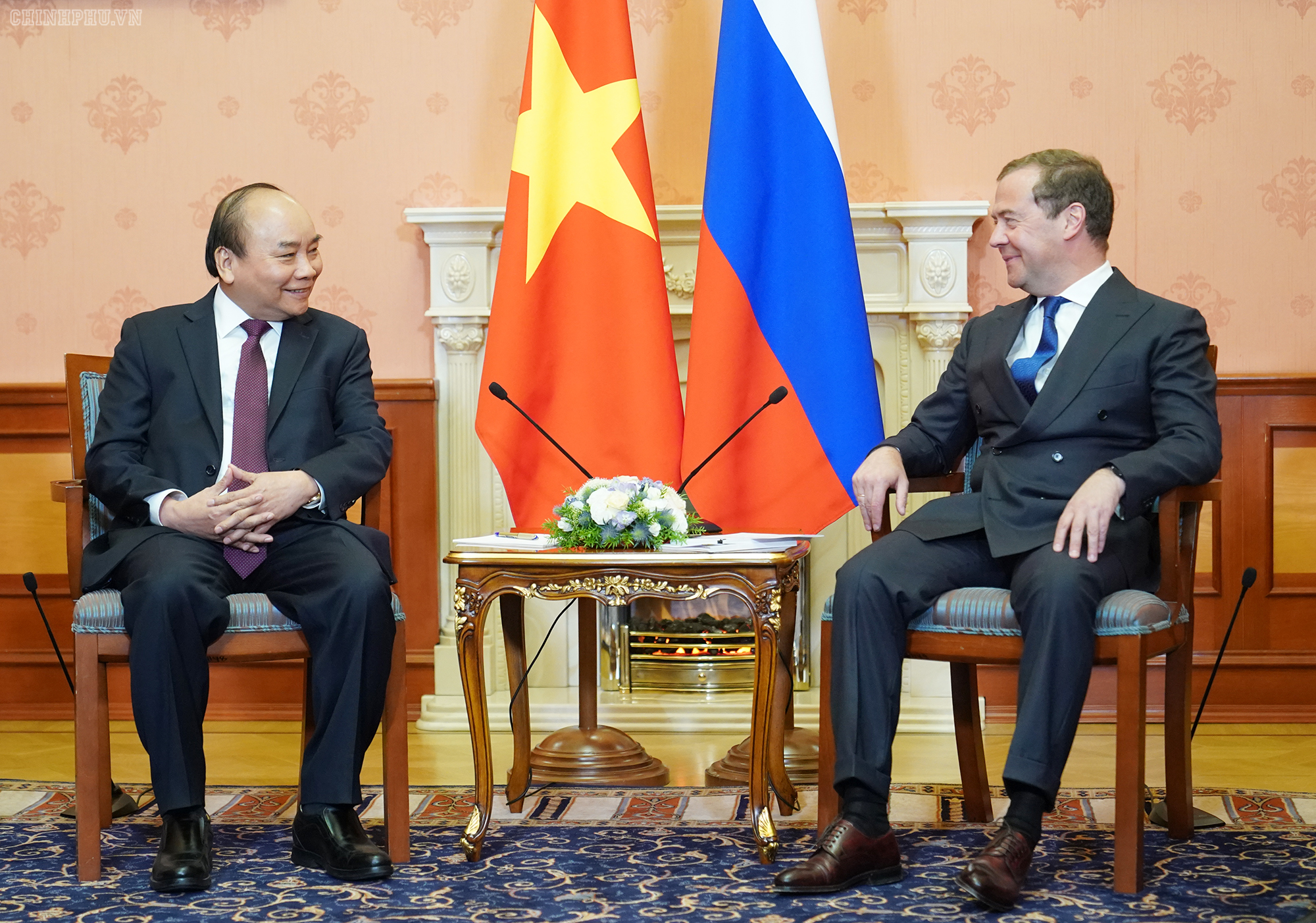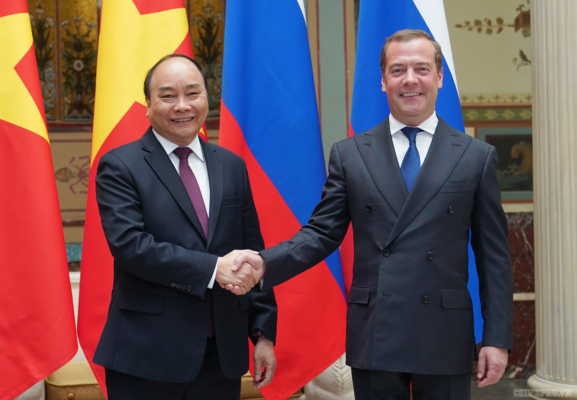 | Thủ tướng Nguyễn Xuân Phúc bắt tayThủ tướng Nga Dmitry Medvedev trước hội đàm. Ảnh: VGP/Quang Hiếu |