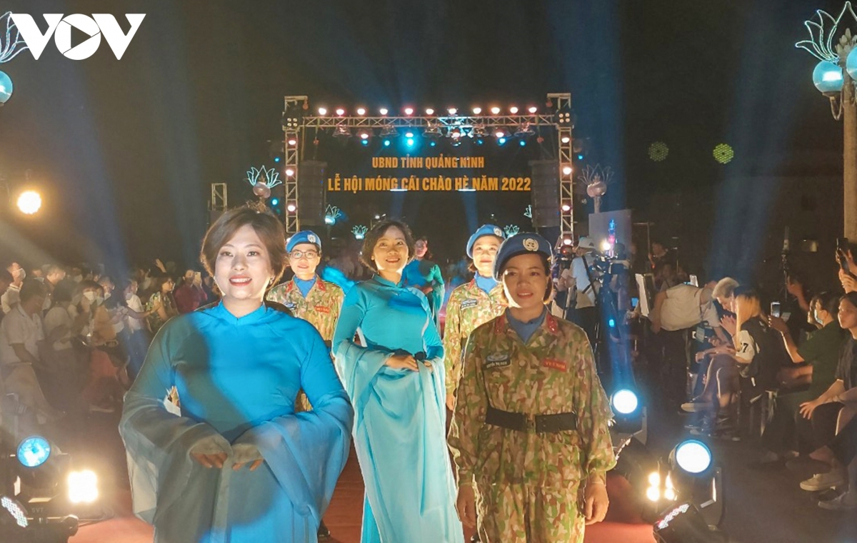 Đêm 30/4, trên cây cầu Ka Long, màn trình diễn áo dài “Dấu ấn nơi địa đầu Tổ quốc” càng thêm ý nghĩa khi có sự giao lưu của các nữ sỹ quan, chiến sỹ “mũ nồi xanh” của Việt Nam chuẩn bị lên đường làm nhiệm vụ tại phái bộ Gìn giữ hoà bình của Liên Hợp Quốc tại Nam Sudan. |