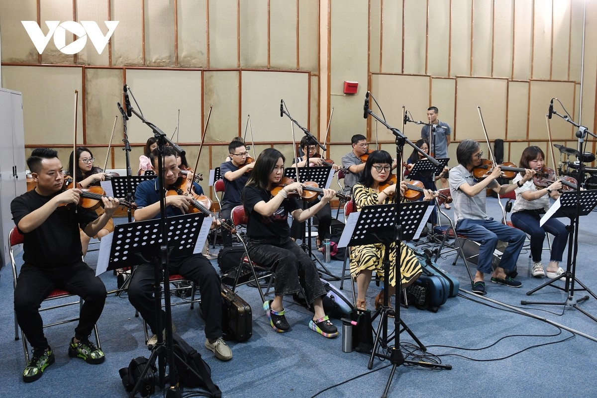 Các nghệ sĩ trong dàn nhạc VOV đang gấp rút tập luyện cho chương trình từ ngày 5/8. |