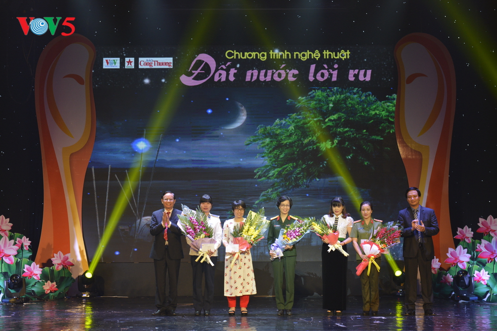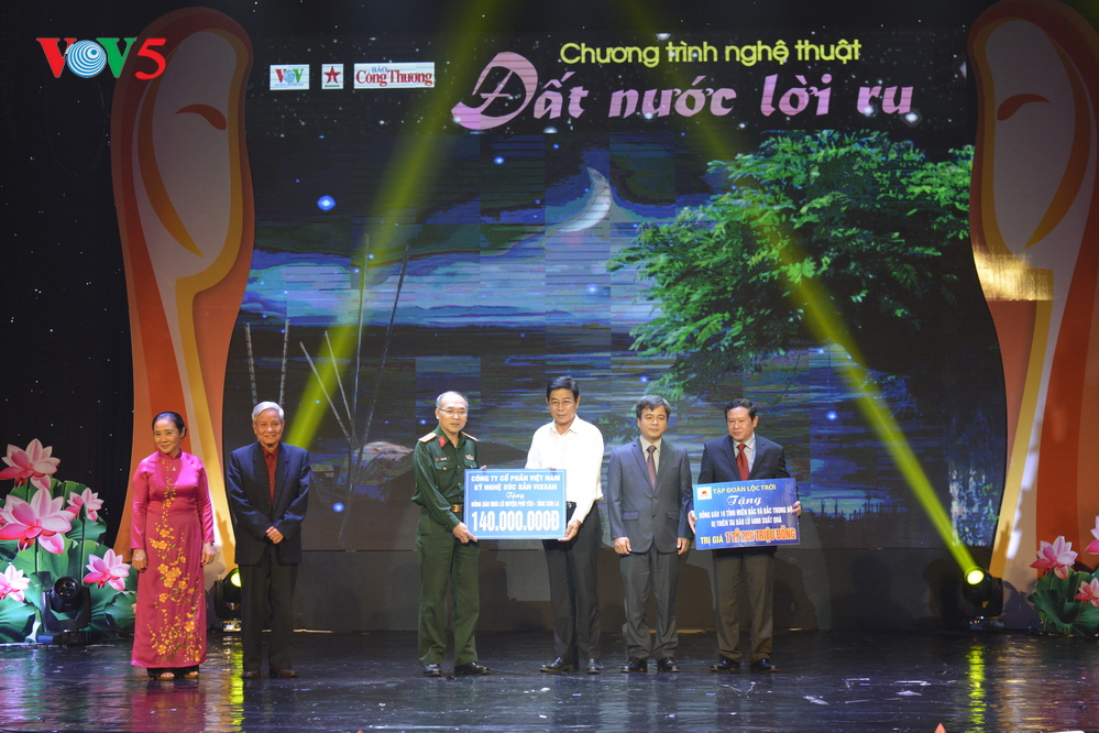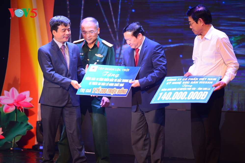 | Ban tổ chức chương trình “Đất nước lời ru” trao 4.000 suất quà trị giá 1 tỷ 200 triệu đồng, ủng hộ đồng bào 10 tỉnh miền Bắc và Bắc Trung bộ vừa bị thiên tai, gồm Nghệ An, Thanh Hóa, Ninh Bình, Nam Định, Thái Bình, Quảng Ninh, Hà Nội, Hòa Bình, Sơn La, Yên Bái. |