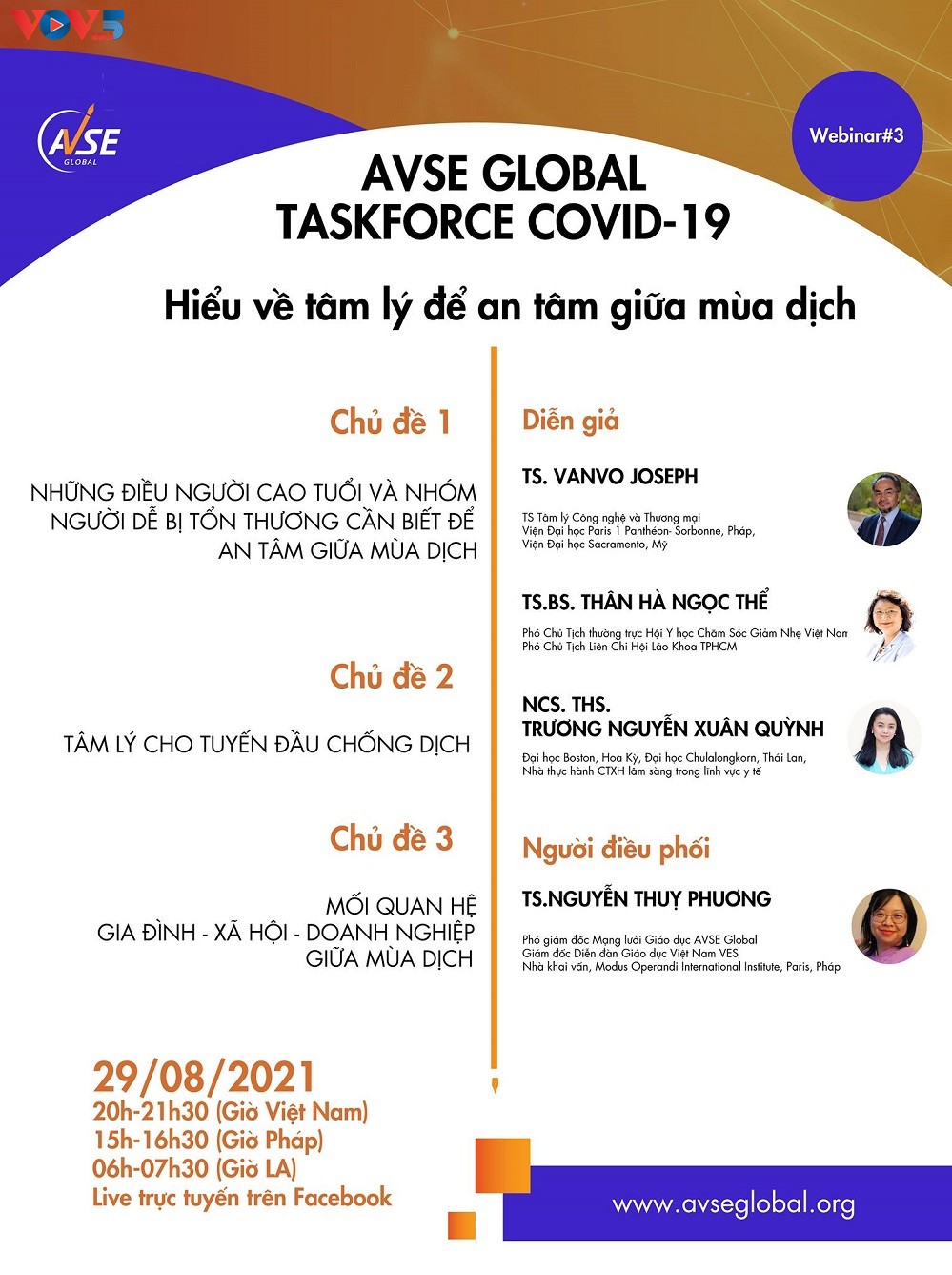 Trong vai trò điều phối chương trình hội thảo, TS. Nguyễn Thụy Phương - Phó Giám đốc mạng lưới giáo dục AVSE Global, Chủ tọa diễn đàn Giáo dục Việt Nam VES nhấn mạnh tầm quan trọng của việc chuẩn bị đầy đủ và toàn diện tâm lý - tinh thần - thể chất để đối phó hiệu quả và lâu dài với đại dịch. TS. BS. Thân Hà Ngọc Thể - Phó Chủ tịch thường trực Hội Y học Chăm sóc giảm nhẹ Việt Nam, Phó Chủ tịch Chi hội Lão khoa TP. Hồ Chí Minh đề xuất giải pháp tâm lý đối với người cao tuổi: “Xin gửi lời đến những người cao tuổi, hãy tập thở, tập mỉm cười, hãy tập nói lời yêu thương. Yêu thương bản thân mình và yêu thương những người xung quanh.”
