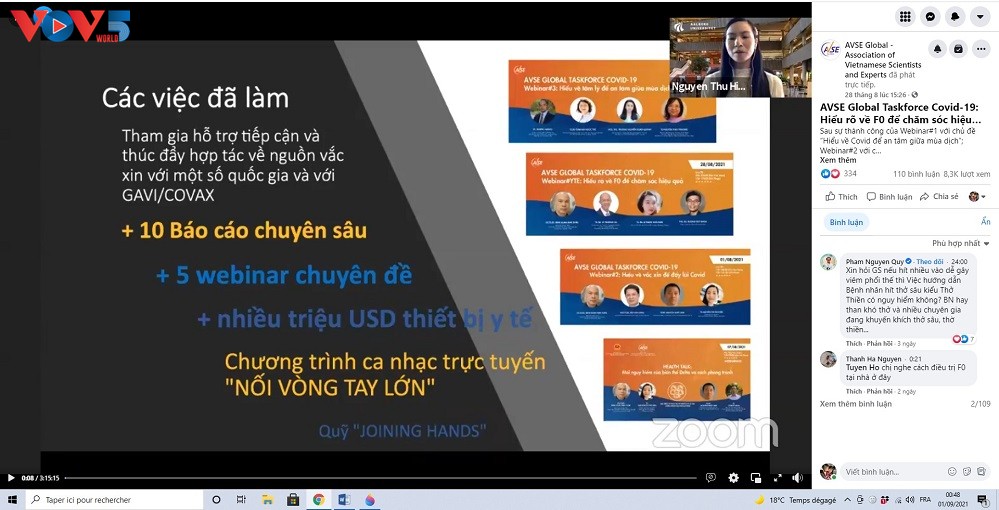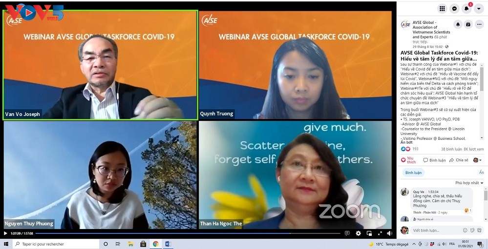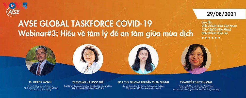 Cuối tuần qua, Nhóm phản ứng nhanh chống Covid-19 (Taskforce Covid-19) của Hội khoa học và chuyên gia Việt Nam toàn cầu (AVSE Global) tổ chức hai cuộc hội thảo trực tuyến về các chủ đề rất thiết thực là “Hiểu rõ về F0 để chăm sóc hiệu quả” và "Hiểu về tâm lý để an tâm giữa mùa dịch". Các webinar này nằm trong chuỗi hội thảo chuyên đề để những chuyên gia người Việt có kinh nghiệm tham gia chống Covid-19 tại các nước phát triển cùng trao đổi và cung cấp thông tin cũng như các khuyến nghị quan trọng hỗ trợ chính phủ và nhân dân Việt Nam chống dịch trong ngắn và dài hạn.