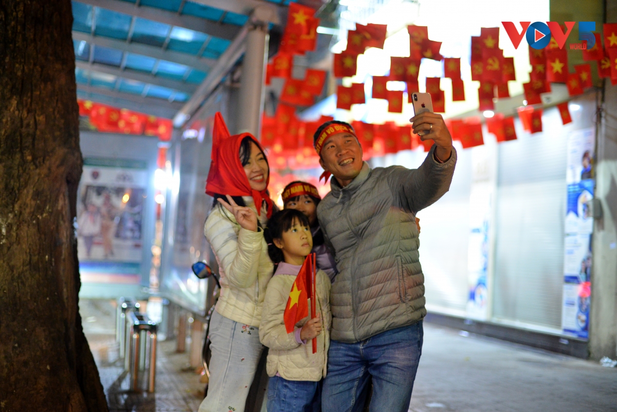 Cũng có không ít gia đình chọn cách đi bộ, dắt theo trẻ em để cùng tận hưởng bầu không khí, niềm vui chiến thắng.