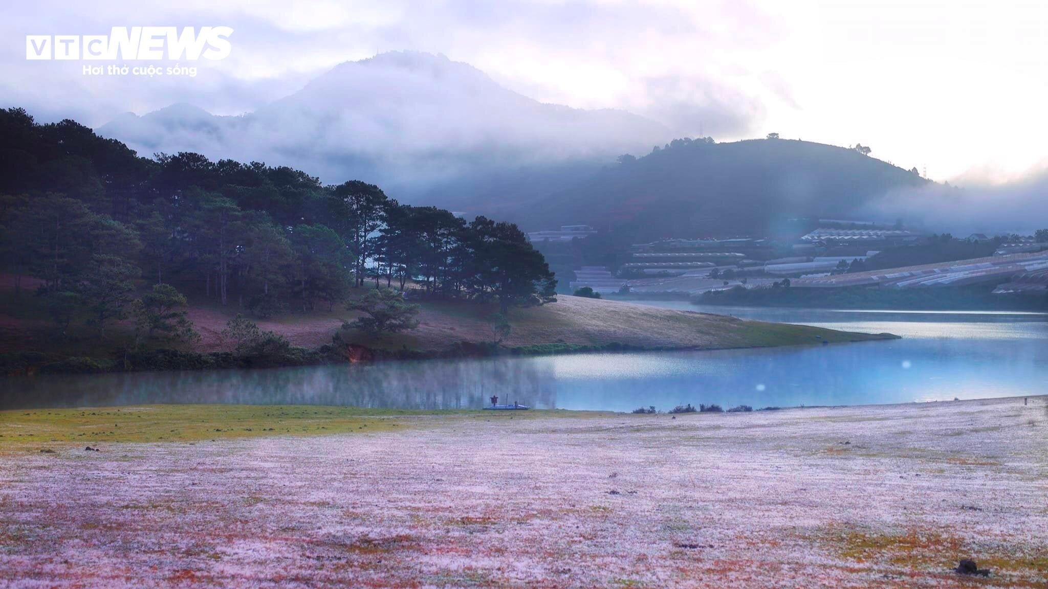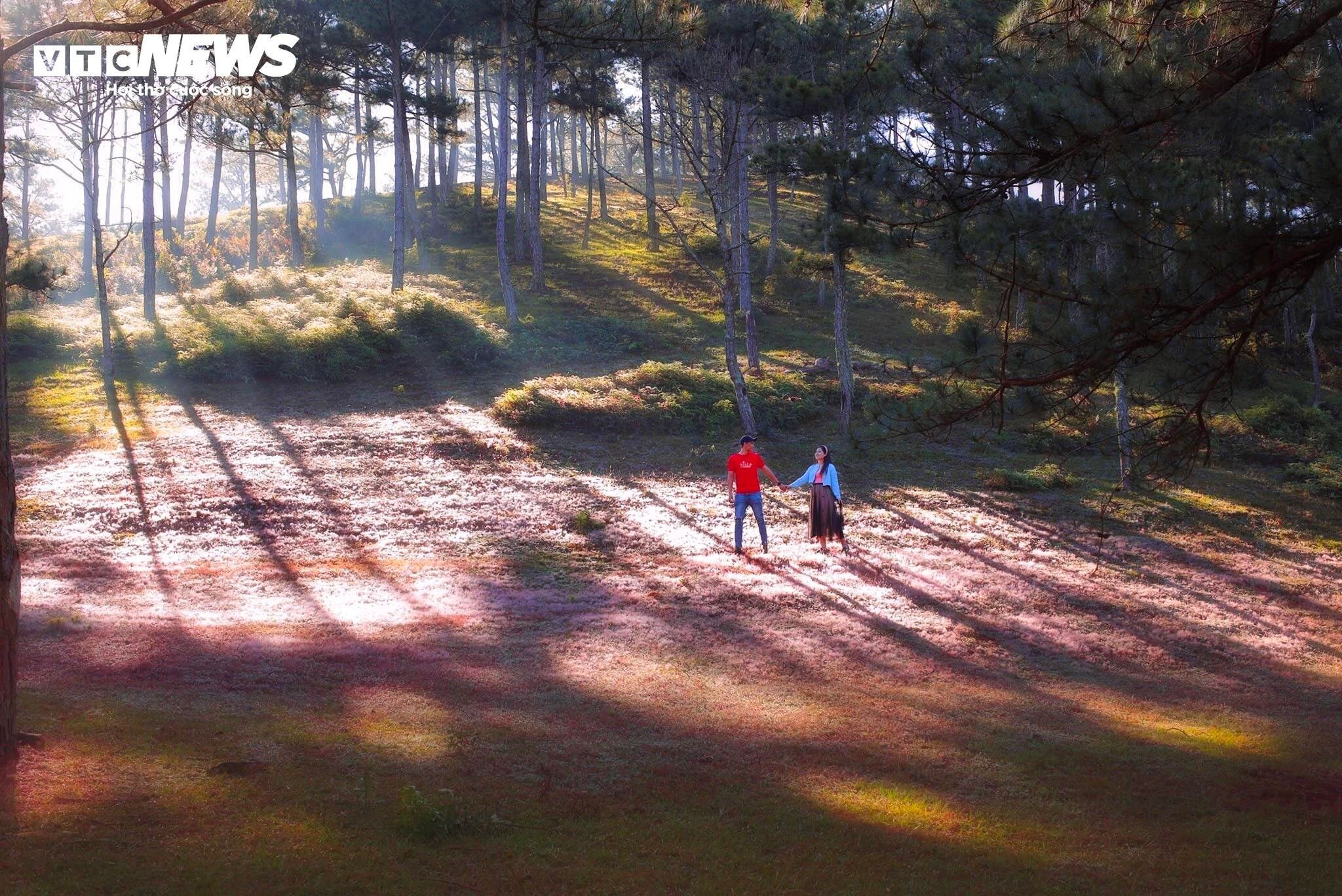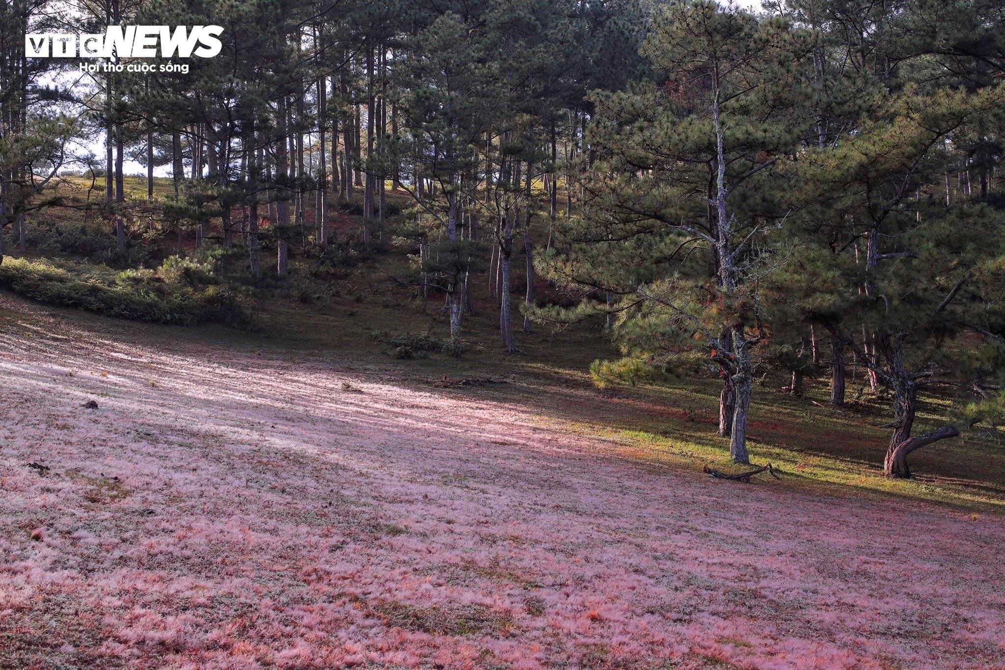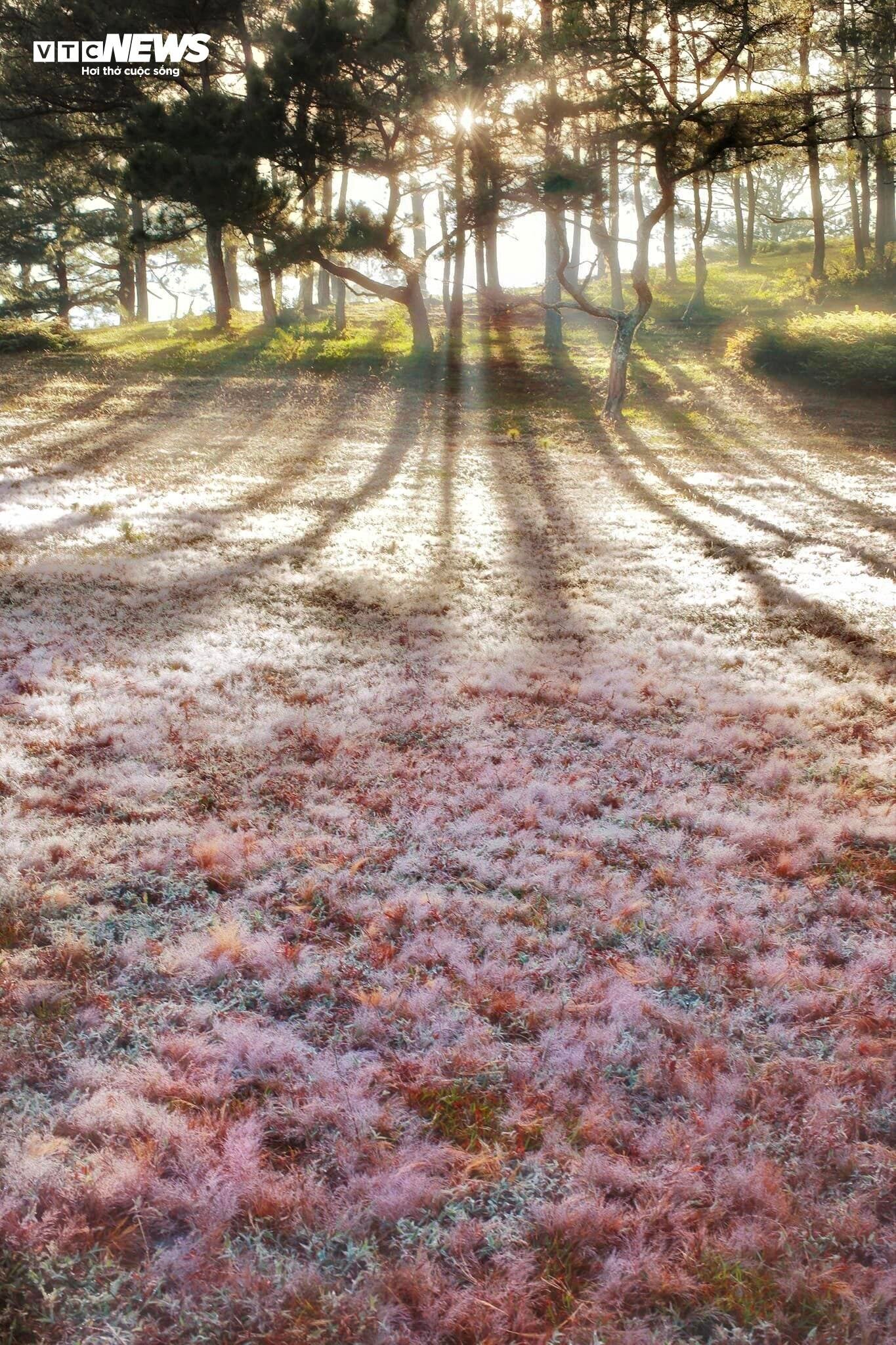 Khi mặt trời lấp ló sau những rặng thông, sương đêm vẫn còn đọng trên ngọn cỏ khiến không gian rất đẹp và long lanh. |