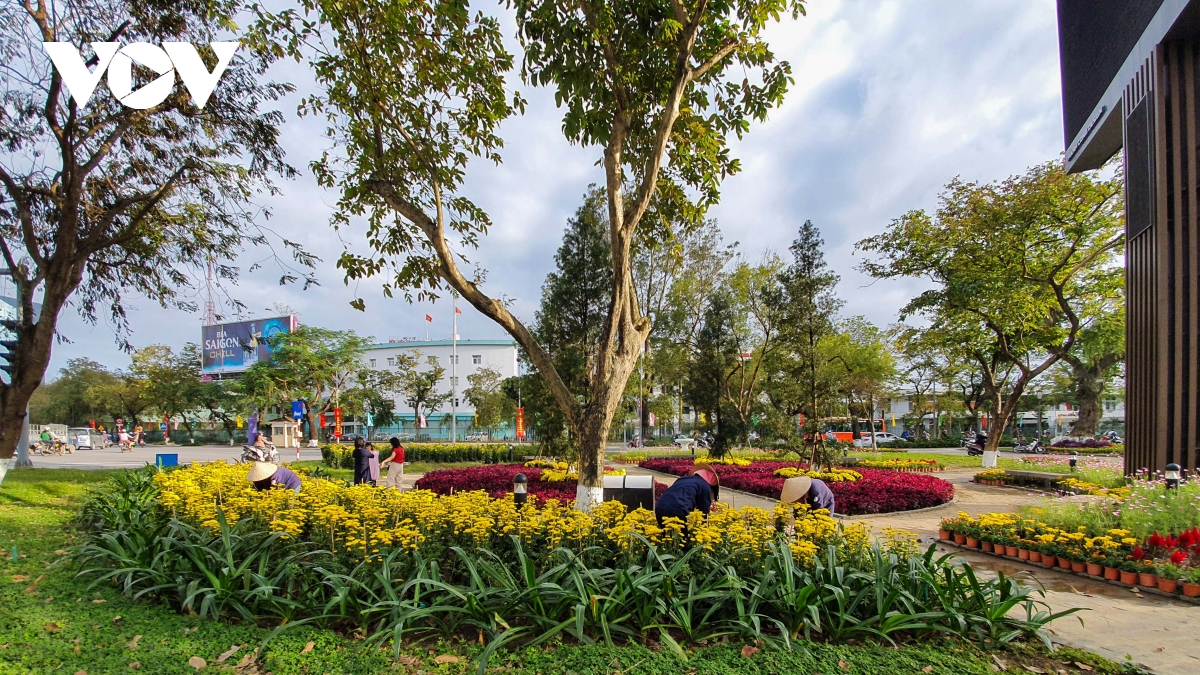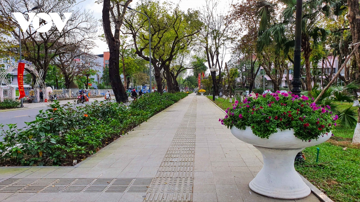 Vỉa hè sạch đẹp và được trưng thêm hoa nhằm mang lại 1 không gian xanh sạch đẹp để người dân Huế đón tết cổ truyền./.