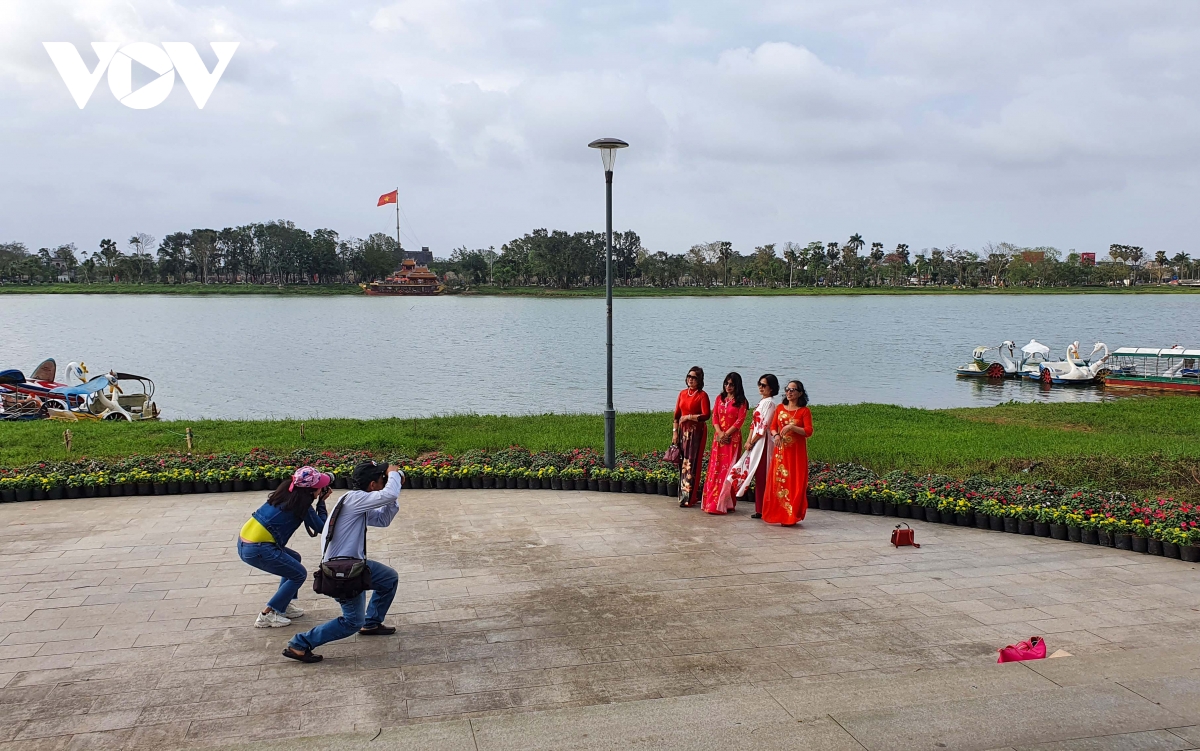 Dù mới 25 tháng chạp nhưng nhiều người dân Huế đã diện áo dài xúng xính chụp ảnh mùa xuân.