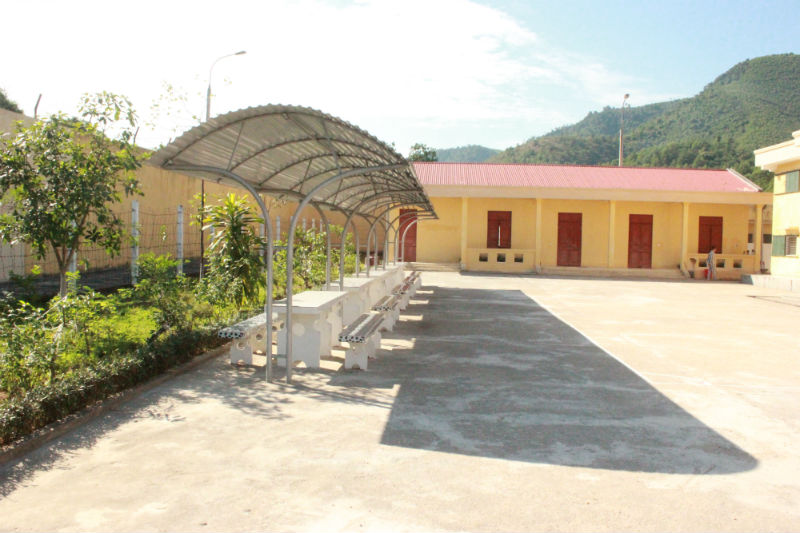 Trước nhà là dãy bàn ghế có mái che, nơi phạm nhân ngồi chơi vào mỗi buổi sáng hoặc chiều về. Cuối dãy là nhà ăn tập thể.