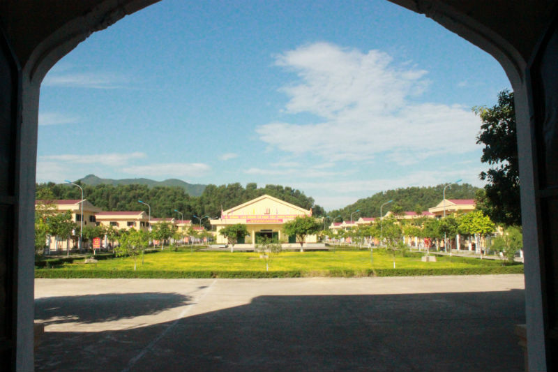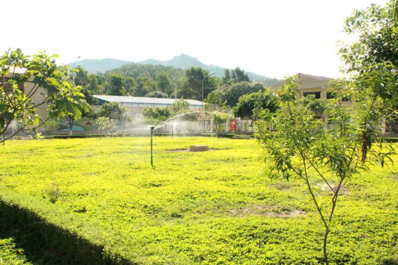 Sân trước hội trường, giữa hai dãy nhà giam được trông hoa và tưới nước tự động. Những tháng cuối năm được trồng hoa hướng dương nở vàng rực khắp khuân viên trại.