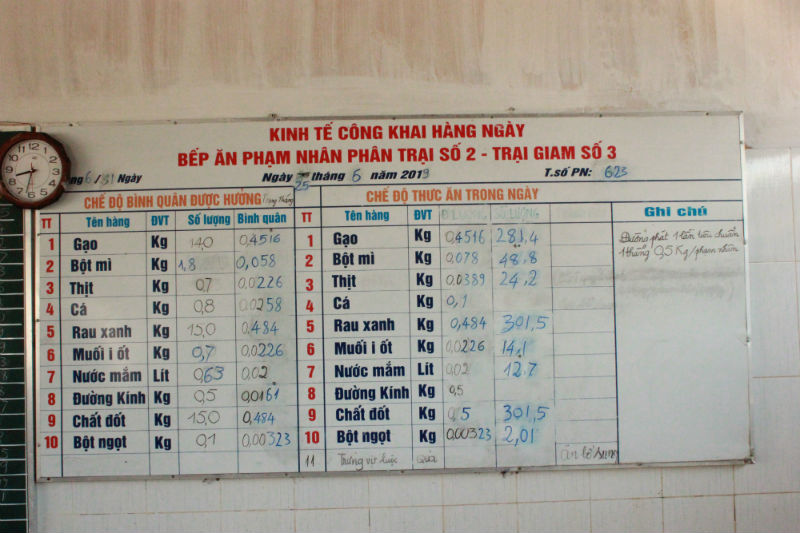 Hàng ngày, phạm nhân được ăn ba bữa, với định suất theo đúng quy định của Nhà nước và có phần cải thiện từ thành quả lao động.