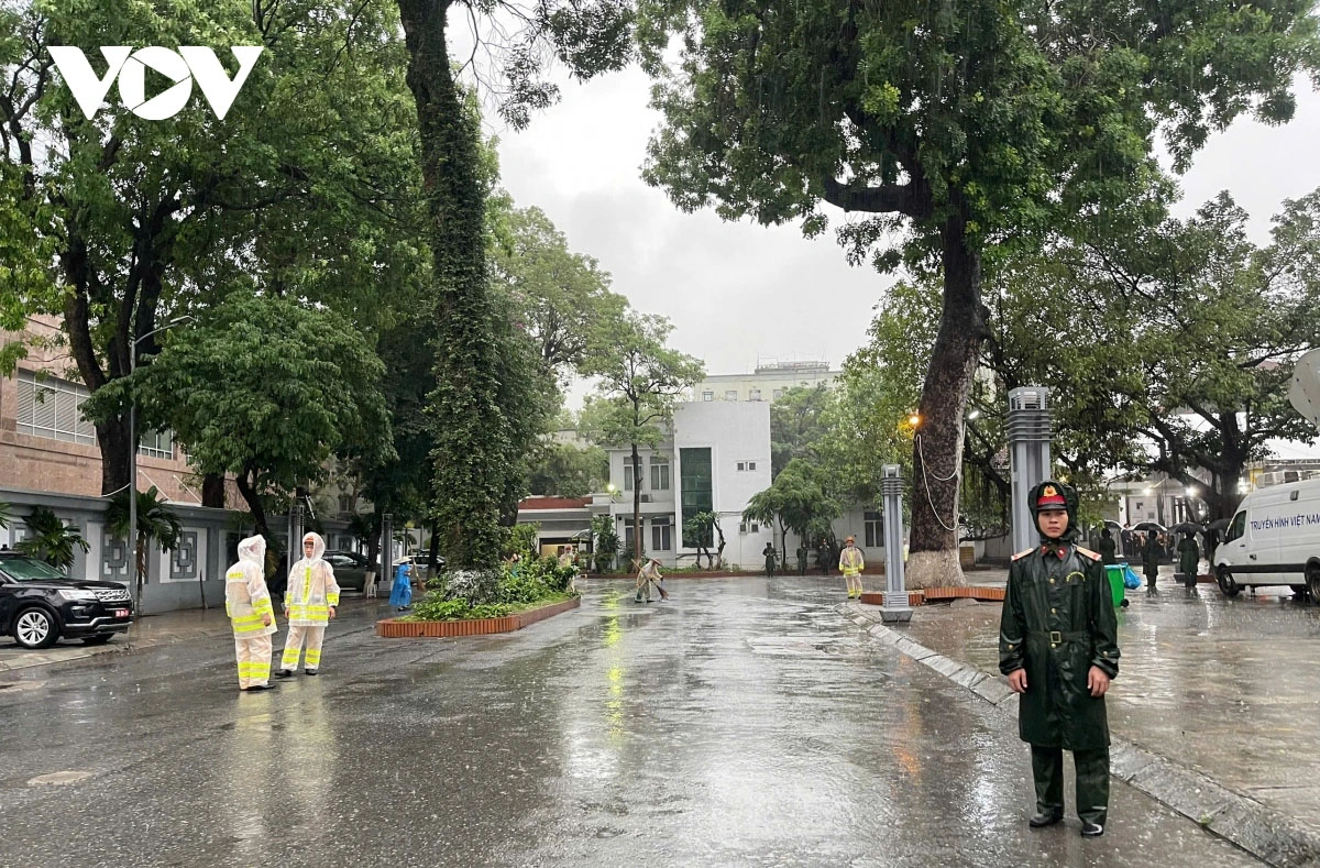 | Hà Nội trời mưa nặng hạt. Khu vực xung quanh Nhà tang lễ Quốc gia, số 5 Trần Thánh Tông, Hà Nội - nơi đặt linh cữu nguyên Chủ tịch nước Trần Đức Lương, lực lượng chức năng đã có mặt, nghiêm túc thực hiện nhiệm vụ, bảo đảm an ninh trật tự cao nhất cho quốc tang. |