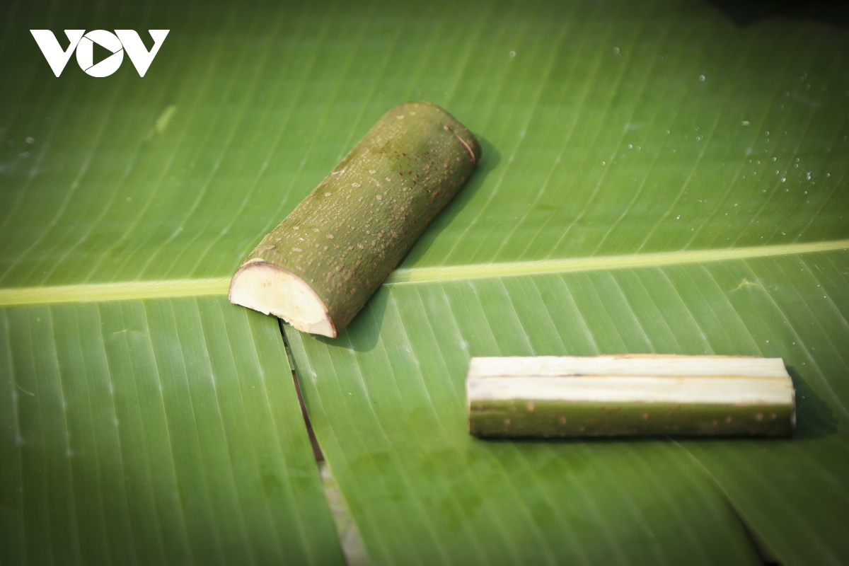 | Thầy mo sẽ chọn một thân cây nhỏ, chặt làm 13 khúc dài 10cm và chẻ đôi để làm quẻ âm dương, nhằm câu thông với thần linh. |