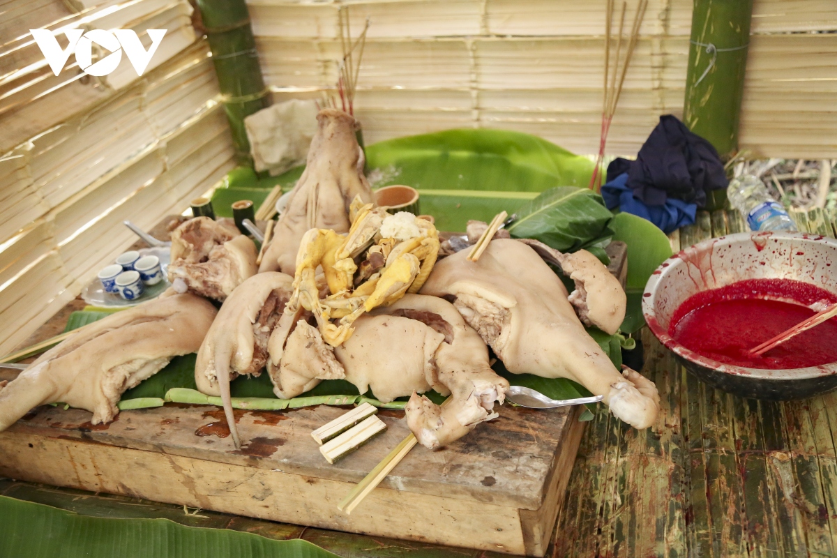 | Lễ vật bao gồm thịt lợn, thịt gà, rượu, xôi nếp. |